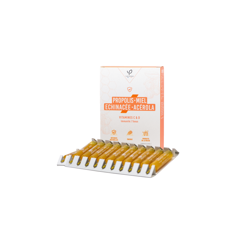 Atėjus rudeniui ir žiemai, ir bet kuriuo kitu metų laiku, ši visapusiška formulė su natūralios kilmės veikliosiomis medžiagomis yra geriausias sąjungininkas, padedantis palaikyti jūsų natūralią apsaugą, ypač dėl sudėtyje esančių vitaminų C ir D.MAISTINĖS MEDŽIAGOS●Rausvažiedės ežiuolės ekstraktas padeda palaikyti natūralią organizmo apsaugos funkciją, padeda nuraminti gerklę, ryklę ir balso stygas. ●Propolis yra augalinė medžiaga, kurią renka bitės ir naudoja kaip skiedinį savo aviliui dezinfekuoti. ●Medus suteikia saldumo ir malonaus skonio. ●Kraštuotojoje malpigijoje (aceroloje) yra vitamino C. Vitaminas C padeda palaikyti normalią imuninės sistemos veiklą, normalią nervų sistemos veiklą ir normalią psichologinę funkciją, padeda apsaugoti ląsteles nuo oksidacinės pažaidos, padeda mažinti pavargimo jausmą ir nuovargį.●Vitaminas D padeda palaikyti normalią imuninės sistemos veiklą.1-oje ampulėje: ●Medus 1500 mg;●Kraštuotosios malpigijos sulčių koncentrato milteliai 320 mg;●Propolio ekstraktas 120 mg;●Rausvažiedės ežiuolės ekstraktas 50 mg;●Vitaminas C 80 mg (100% RMV*);●Vitaminas D 2,5 μg (50% RMV*).RMV* - referencinė maistinė vertė.Maisto papildas. 20 ampulių po 10 ml. Grynasis kiekis 200 ml.Gamintojas: Laboratoires Yves Ponroy, 85612 Montaigu, PrancūzijaGavėjas :