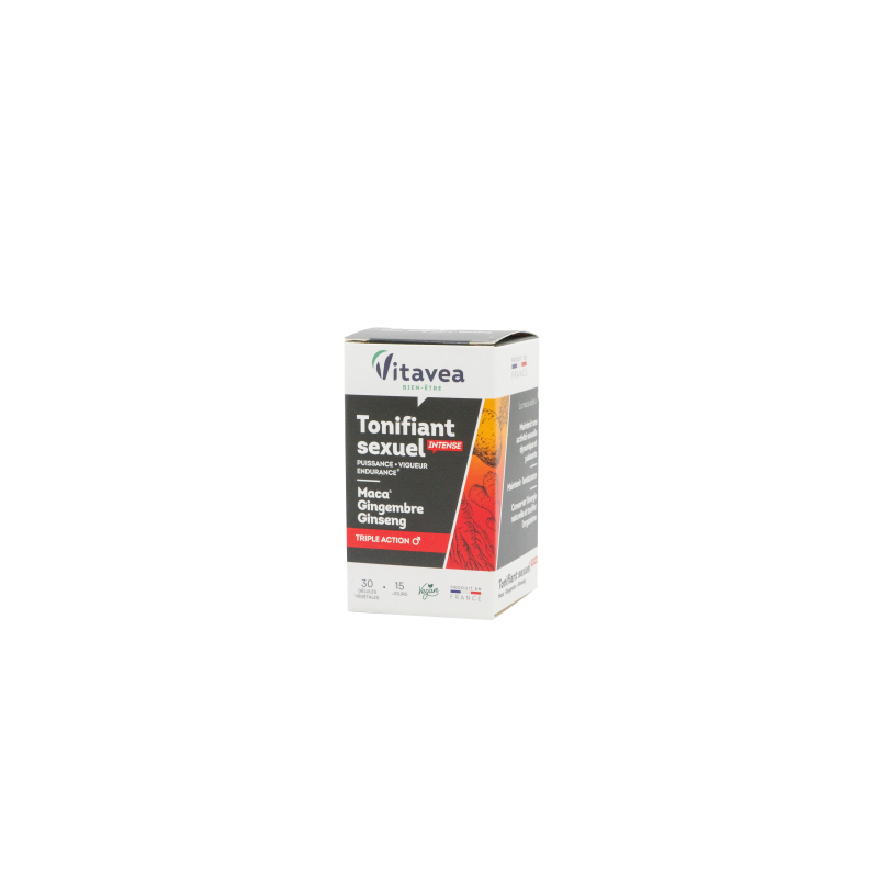 ●Galia ●Jėga ●Ištvermė Trigubas poveikis.Tonifiant sexuel formulė turi gerai žinomų ir pripažintų veikliųjų medžiagų, padedančių palaikyti seksualinį pajėgumą ir fizinį aktyvumą. MAISTINĖS MEDŽIAGOS●Maca (Peruvinė pipirnė) padeda palaikyti seksualinę funkciją, normalų vaisingumą ir reprodukcinę funkciją, normalią psichologinę funkciją, normalią hormoninės sistemos veiklą, padeda palaikyti gyvybingumą.*●Kininiai ženšeniai padeda palaikyti normalią energiją ir gyvybingumą, normalią psichologinę/protinę funkciją, normalią imuninės sistemos veiklą, normalią seksualinę funkciją. * ●Imbiero ekstraktas padeda palaikyti normalią: virškinamojo trakto, imuninės sistemos, širdies veiklą, padeda mažinti diskomforto pojūtį (vėmimas, galvos svaigimas) keliaujant, padeda apsaugoti ląsteles nuo oksidacinės pažaidos. Padeda palaikyti energiją ir gyvybingumą, normalų cukraus kiekį kraujyje, normalią kvėpavimo takų funkciją.**Teiginiai apie sveikatingumą laukia ES patvirtinimo. 2-ose kapsulėse:●Maca (Peruvinės pipirnės) ekstraktas (ekvivalentas) 2200 mg, gryno ekstrakto 550 mg;●Tikrojo imbiero ekstraktas (ekvivalentas) 500 mg, gryno ekstrakto 100 mg; ●Kininio ženšenio ekstraktas (ekvivalentas) 510 mg, gryno ekstrakto 17 mg.Maisto papildas. 30 augalinės kilmės kapsulių. Grynasis kiekis 15 g.Gamintojas: Vitavea, laboratoires Vitarmonyl, 85612 Montaigu, PrancūzijGavėjas :