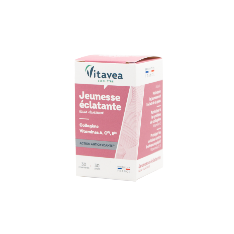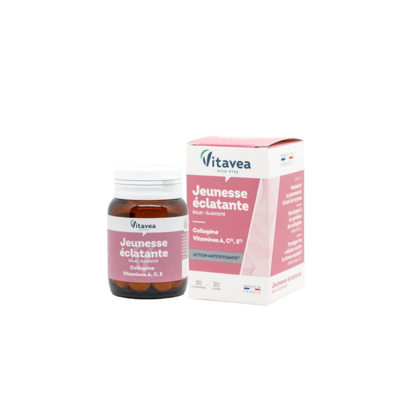 Vitavea Elastinga ir švytinti odaVeiksmingas sprendimas kovojant su senėjimo požymiais.Inovatyvus, viena kitą papildančių veikliųjų medžiagų kompleksas, kuris veikia kaip barjeras nuo laisvųjų radikalų ir palaiko odos jaunatviškumą.AKTYVIOSIOS MEDŽIAGOS●Kolagenas: būtinas norint sustiprinti odos struktūrą ir sumažinti raukšles.* ●Vitaminas C padeda palaikyti normalų kolageno, kuris reikalingas normaliai odos funkcijai, susidarymą. Padeda atstatyti redukuoto pavidalo vitaminą E, padeda palaikyti normalią nervų sistemos veiklą ir psichologinę funkciją, padeda apsaugoti ląsteles nuo oksidacinės pažaidos.●Vitaminas E padeda apsaugoti ląsteles nuo oksidacinės pažaidos.●Vitaminas A padeda palaikyti normalią gleivinių ir odos būklę, geležies apykaitą, imuninės sistemos veiklą, padeda išsaugoti normalų regėjimą bei atlieka tam tikrą funkciją ląstelių specializacijoje.*Pateikta informacija apie produkto sudedamąsias dalis yra pagrįsta tyrimais. Tai nėra EFSA nuomonė.1-oje tabletėje:●Žuvų kolageno hidrolizatas 300 mg, kuriame kolageno peptidų 270 mg;●Vitaminas C 80 mg (100% RMV*);●Vitaminas E 12 mg α-TE (100% RMV*);●Vitaminas A 800 µg (100% RMV*).RMV *- referencinė maistinė vertė.Maisto papildas. 30 tablečių. Grynasis kiekis 20,4 g.Gamintojas: Vitavea - Laboratoires Yves Ponroy, Parc d'activité Sud Loire - 85612 Montaigu Cedex – PrancūzijGavėjas :