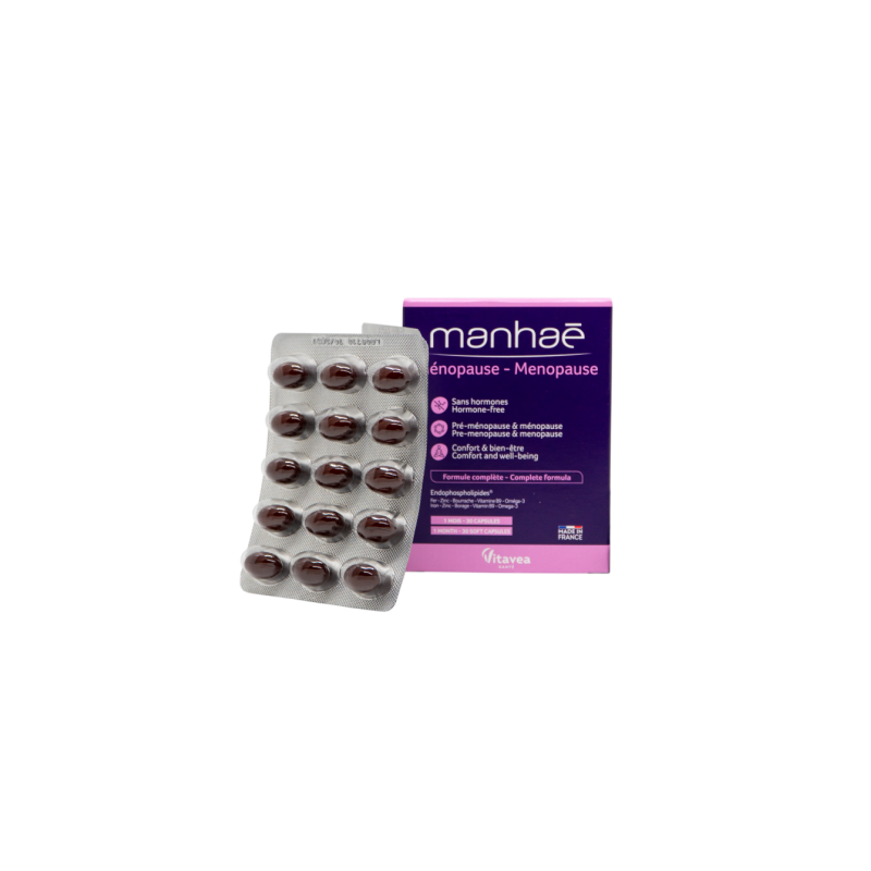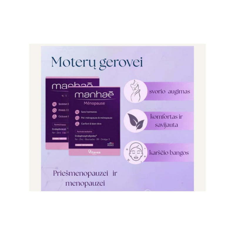 VITAVEA Manhaé Menopauzė - naujas maisto papildo MENODYNE pavadinimas. Analogiška sudėtis ir vartojimas.Menopauzė yra natūralus reiškinys moters gyvenime, kuriam būdingi daug fizinių ir psichologinių nepatogumų: karščio bangos, nuotaikos ir miego sutrikimai, nuovargis, dirglumas, odos elastingumo praradimas.VITAVEA Manhaé Menopauzė buvo specialiai sukurtas moterims, ieškančioms natūralios alternatyvos šiuo laikotarpiu. Jo išskirtinė, pilnavertė natūralių medžiagų formulė, padeda išlaikyti harmoniją ir gerą savijautą subtiliu priešmenopauzės ir menopauzės laikotarpiu. Be hormonų. Be sojos. Padeda sumažinti nuovargį ir išlaikyti odos švytėjimą, apsaugoti ląsteles nuo oksidacinės pažaidos, palaikyti normalią plaukų, nagų, kaulų būklę, normalią imuninės sistemos veiklą. Neturi šalutinio poveikio.●Komfortas ir gera savijauta premenopauzės ir menopauzės metu.●Formulė be hormonų, be sojos.●Moksliškai patikrintas efektyvumas.Pastebimai sumažina priešmenstruacinį sindromą, priešmenopauzinius ir menopauzinius sutrikimus. Buvo atlikti tyrimai (VT 2413) su moterimis nuo 47 iki 76 metų amžiaus. Po 1 mėnesio, vartojant Manhae Menopauzė, gauti tokie atsiliepimai:76% patenkintų vartotojų: 85% sumažėjo nuovargio pojūtis 83% nevargino karščio bangos 81% nebeprakaitavo naktimis 74% nebevargino miego sutrikimai 64% nebevargino apsunkusių kojų pojūtis 69% teigiamai įvertino geresnę odos būklę.Prancūzijoje šis Manhae produktas įvertintas kaip Nr 1.MAISTINĖS MEDŽIAGOS●Endofosfolipidai® - yra kompleksiniai lipidai, vadinami fosfolipidais, kuriuose gausu ilgos grandinės polinesočiųjų omega 3 rūgščių. Šie fosfolidai išgauti iš Antarktinių krilvėžių (Euphausia superba).●Apelsininio citrinmedžio ekstrakte yra bioflavonoidų.●Omega 3 rūgštys EPR ir DHR padeda palaikyti normalią širdies veiklą**. DHR padeda palaikyti normalią smegenų funkciją, padeda išsaugoti normalų regėjimą*.●Vaistinės agurklės aliejus - padeda palaikyti normalią skysčių iš organizmo pašalinimo funkciją.***●Geležis ir folio rūgštis padeda mažinti pavargimo jausmą ir nuovargį, padeda palaikyti normalią imuninės sistemos veiklą.●Folio rūgštis padeda palaikyti normalią psichologinę funkciją, padeda palaikyti normalią kraujodarą.●Beta karotenas mūsų organizme virsta vitaminu A. Vitaminas A padeda palaikyti normalią odos būklę, normalią imuninės sistemos veiklą.●Cinkas padeda palaikyti normalią odos, plaukų, nagų, kaulų būklę, normalią imuninės sistemos veiklą.●Geležis padeda palaikyti normalų raudonųjų kraujo kūnelių ir hemoglobino susidarymą.●Vitaminas E ir cinkas padeda apsaugoti ląsteles nuo oksidacinės pažaidos.*teigiamas poveikis pasireiškia per parą suvartojant 250 mg DHR**teigiamas poveikis pasireiškia per parą suvartojant 250 mg DHR ir EPR.***Teiginys apie sveikatingumą laukia ES patvirtinimo.1-oje kapsulėje: ●Vitaminas E 12 mg α-TE (100 % RMV*)●Folio rūgštis 200 µg (100 % RMV*)●Geležis 5,7 mg (40,7 % RMV*)●Cinkas 5 mg (50 % RMV*)●Beta karotenas 3,1 mg●Apelsininio citrinmedžio ekstraktas 170 mg●Vaistinių agurklių aliejus 135 mg●Žuvų taukai 161 mg●Antarkties krilių vėžiagyvių (Euphausia superba) lipidų ekstraktas35 mg, kuriame fosfolipidų 14 mg●Omega 3 riebalų rūgštys 93 mg, kuriose EPR: 50,9 mg, DHR: 32,5 g.*RMV – referencinė maistinė vertė.Maisto papildas. 30 kapsulių. Grynasis kiekis 27,6 g.Gamintojas: Vitavea, Parc d'activité Sud Loire - 85612 Montaigu Cedex, PrancūzijGavėjas :