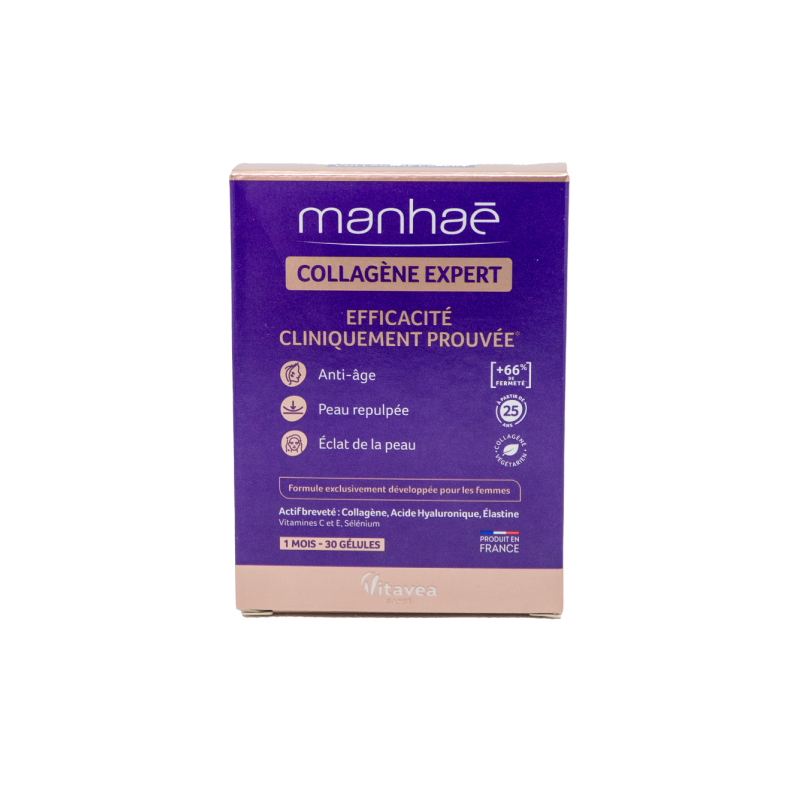 VITAVEA Manhae Collagen Expert Kolageno ekspertasNovatoriškas maisto papildas, specialiai sukurtas moterims, jų odos grožiui ir jaunatviškumui palaikyti. Padeda kovoti su odos senėjimu, prisideda prie raukšlių mažinimo ir odos stangrumo. Manhae Collagen Expert novatorišką formulę sudaro patentuotas bioaktyvių medžiagų kompleksas, išgautas iš kiaušinio lukšto membranos. Šiame komplekse yra 3-ų pagrindinių odos komponentų - kolageno, hialurono rūgšties ir elastino molekulių, kurios veikia sinergiškai, stiprindamos viena kitos veikimą. Formulė praturtinta vitaminais C, E ir selenu.●Vegetariškas kolagenas.●Formulė sukurta mikromitybos ekspertų. ●Įrodytas veiksmingumas*: 20 klinikinių tyrimų, atliktų su naujos kartos patentuota bioaktyvia veikliąja medžiaga iš kiaušinio lukšto membranos, įrodė jos veiksmingumą. odos stangrumas +66%*, veido drėkinimas +43%*, odos elastingumas +25%*. ●Be glitimo, be laktozės, be cukraus ir be želatinos. Be dirbtinių skonių ir dažiklių.●Pagaminta Prancūzijoje, Vitavea laboratorijoje Vandėja regione, laikantis geros gamybos praktikos (GGP) ir kokybės (ANSM - Nacionalinės vaistų ir sveikatos produktų saugos agentūros) procesų. *2018 m. atliktas klinikinis tyrimas, palyginti su placebu, vartojant 300 mg kiaušinio lukšto membranos per dieną (po 1 kapsulę), 16 žmonių, nuo 45 iki 75 metų amžiaus, 60 dienų.MAISTINĖS MEDŽIAGOS●Kolagenas: būtinas norint sustiprinti odos struktūrą ir sumažinti raukšles.* ●Hialurono rūgštis: padeda palaikyti drėgmę, drėkina odą ir gerina jos išvaizdą.*●Elastinas: palaiko odos elastingumą.*●Vitaminas C padeda palaikyti normalų kolageno, kuris reikalingas normaliai odos funkcijai, susidarymą. Padeda atstatyti redukuoto pavidalo vitaminą E, padeda palaikyti normalią nervų sistemos veiklą ir psichologinę funkciją, padeda apsaugoti ląsteles nuo oksidacinės pažaidos.●Vitaminas E padeda apsaugoti ląsteles nuo oksidacinės pažaidos, prisideda prie senėjimo stabdymo.**●Selenas padeda palaikyti normalią plaukų ir nagų būklę, padeda palaikyti normalią imuninės sistemos veiklą, padeda apsaugoti ląsteles nuo oksidacinės pažaidos. *Pateikta informacija apie produkto sudedamąsias dalis yra pagrįsta tyrimais. Tai nėra EFSA nuomonė.1-oje kapsulėje:●Kiaušinio lukšto membrana - 300 mg, kurioje: elastino 75 mg kolageno 66 mg hialurono rūgšties 9 mg●Vitaminas C - 12 mg (15% RMV*)●Vitaminas E - 3 mg α-TE (25% RMV*)●Selenas - 13,76 mg (25% RMV*)RMV *- referencinė maistinė vertė.Maisto papildas. 30 augalinės kilmės kapsulių. Grynasis kiekis 12.9 g. Gamintojas: Vitavea - Laboratoires Yves Ponroy, Parc d'activité Sud Loire - 85612 Montaigu Cedex, PrancūzijGavėjas :