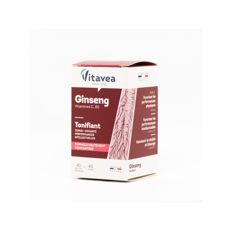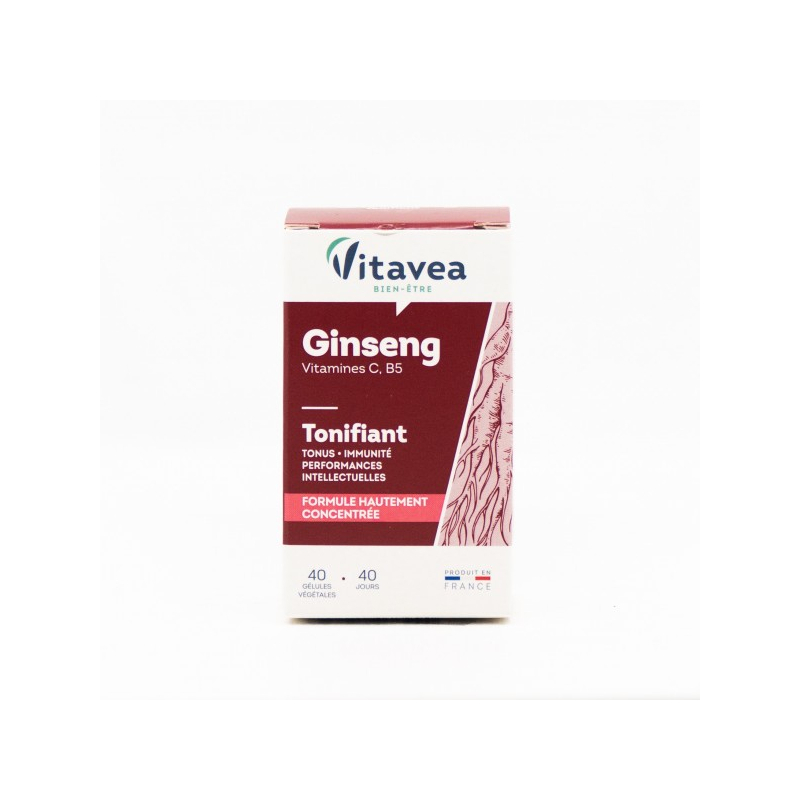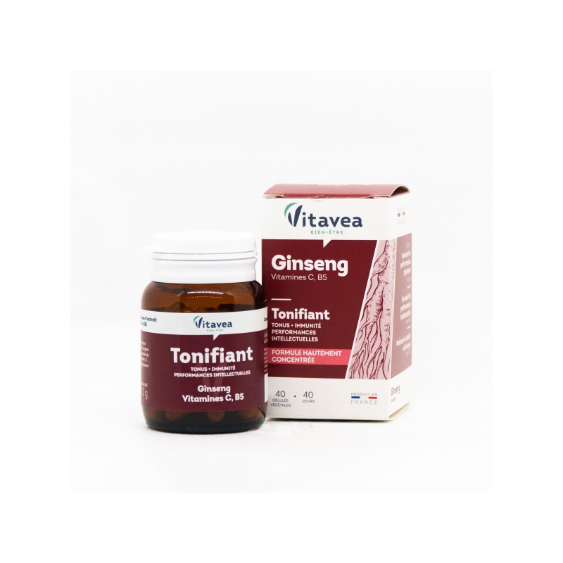 Organizmo tonusui Tonifiant Koncentruota formulė kininio ženšenio pagrindu, praturtinta vitaminais C ir B5.●Kininiai ženšeniai padeda palaikyti ištvermę ir energingumą, padeda palaikyti normalią psichinę/protinę savijautą, normalią imuninės sistemos veiklą, lytinę funkciją. ●Vitaminai C ir B5 padeda palaikyti normalią imuninės sistemos veiklą, padeda mažinti pavargimo jausmą ir nuovargį. ●Vitaminas C padeda palaikyti normalią nervų sistemos veiklą ir psichologinę funkciją, padeda apsaugoti ląsteles nuo oksidacinės pažaidos. ●Vitaminas B5 padeda palaikyti normalią protinę veiklą.1-oje kapsulėje:● Kininio ženšenio ekstraktas (ekvivalentas) 80 mg, gryno ekstrakto 40 mg;● Vitaminas C 40 mg (50% RMV*); ● Vitaminas B5 0,9 mg (15% RMV*). RMV *- referencinė maistinė vertė. Maisto papildas. 40 augalinės kilmės kapsulių. Grynasis kiekis 14,2 g.Vartojimas: 1 kapsulė per dieną ryte, valgio metu, nuryti užgeriant stikline vandens.Sudedamosios dalys: maltodekstrinas; lipnumą reguliuojanti medžiaga: kalcio karbonatas; augalinės kilmės kapsulė (gauta iš celiuliozės); kininio ženšenio ekstraktas (Panax ginseng); L-askorbo rūgštis; lipnumą reguliuojanti medžiaga: riebalų rūgščių magnio druskos; kalcio D-pantetonatas.Nevartoti kaip maisto pakaitalo. Neviršyti rekomenduojamos paros normos. Tinkamumo laikui pasibaigus, produkto vartoti negalima. Laikyti ne aukštesnėje kaip 25°C temperatūroje, vaikams nepasiekiamoje vietoje. Svarbu įvairi ir subalansuota mityba bei sveikas gyvenimo būdas. Nerekomenduojama žmonėms, gydomiems nuo diabeto.Gamintojas: Vitavea, laboratoires Vitarmonyl, 85612 Montaigu, Prancūzija.