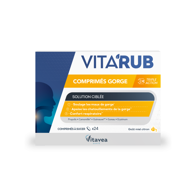 Vitavea VITA’RUB čiulpiamosios tabletės gerkleiŽiemos laikotarpiu dažnai pasireiškiantys aplinkos veiksniai gali turėti įtakos kasdienei savijautai.VITA’RUB čiulpiamosios tabletės gerklei skirtos gerklės ir kvėpavimo takų komfortui palaikyti. Jų sudėtyje yra penkių gerai žinomų augalinių ingredientų derinys: vaistinė ramunė, vaistinė svilarožė, juoduogis šeivamedis, vaistinė pikulė ir propolis, tradiciškai naudojamų gerklės ir kvėpavimo takų komfortui palaikyti, ypač sezoninių pokyčių laikotarpiu. Čiulpiamųjų tablečių forma užtikrina lėtą tirpimą ir ilgalaikį poveikį, kartu suteikiant malonų medaus ir citrinos skonį.TIKSLINGAS TRIGUBAS POVEIKIS GERKLĖS KOMFORTUI●Padeda palaikyti gerklės komfortą.●Padeda raminti sudirgusią gerklę.●Padeda palaikyti kvėpavimo takų komfortą. MAISTINĖS MEDŽIAGOS●Vaistinė svilarožė padeda palaikyti kvėpavimo takų funkciją, turi antibakterinį poveikį*.●Vaistinė ramunė ir juoduogis šeivamedis padeda palaikyti kvėpavimo takų funkciją, padeda palaikyti normalią imuninės sistemos veiklą, padeda apsaugoti ląsteles nuo oksidacinės pažaidos*.●Vaistinė pikulė padeda palaikyti kvėpavimo takų funkciją*. Ji dar vadinama „dainininkų žolele“ ir yra vertinama dėl teigiamo poveikio balsui ir užkimimui.●Propolis yra augalinė medžiaga, kurią renka bitės ir naudoja kaip skiedinį savo aviliui dezinfekuoti.*Teiginiai apie sveikatingumą laukia ES patvirtinimo.4-iose tabletėse: ●Vaistinės svilarožės ekstraktas – 250 mg●Propolio ekstraktas – 40 mg●Juoduogio šeivamedžio ekstraktas – 40 mg●Vaistinės pikulės ekstraktas – 40 mg●Vaistinių ramunių ekstraktas – 24 mgMaisto papildas. 24 medaus - citrinų skonio čiulpiamos tabletės. Grynasis kiekis 55,2 g. Partijos Nr. ir geriausias iki pabaigos: nurodyta ant pakuotės.Gamintojas: Vitavea, 85612 Montaigu Cedex, PrancūzijGavėjas :