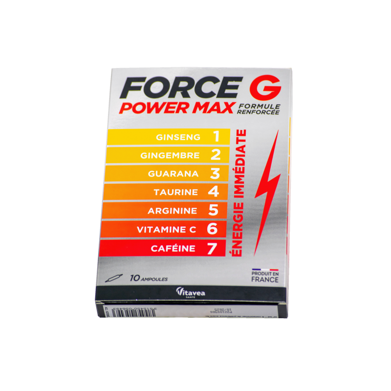 Maksimali galia Force G Power MAX turtinga formulė sujungia 7 aktyvius ingredientus: ženšenį, imbierą, gvaraninę pauliniją, tauriną, argininą, vitaminą C ir kofeiną, kurie padeda palaikyti ištvermę, energingumą ir, esant per dideliam nuovargiui, akimirksniu suteikia tonuso, energijos ir gyvybingumo.●Kininiai ženšeniai padeda palaikyti normalią energiją ir gyvybingumą, normalią psichologinę/protinę funkciją, normalią imuninės sistemos veiklą, normalią seksualinę funkciją.* ●Imbiero ekstraktas padeda palaikyti normalią: virškinamojo trakto, imuninės sistemos, širdies veiklą, padeda mažinti diskomforto pojūtį (vėmimas, galvos svaigimas) keliaujant, padeda apsaugoti ląsteles nuo oksidacinės pažaidos. Padeda palaikyti energiją ir gyvybingumą, normalų cukraus kiekį kraujyje, normalią kvėpavimo takų funkciją.*●Gvaraninės paulinijos ekstraktas padeda palaikyti normalią protinę veiklą, normalią riebalų apykaitą, normalų kūno svorį, normalią medžiagų apykaitą ir apsaugą nuo neigiamo streso ir aplinkos poveikio, normalią virškinimo sistemos veiklą. Jo sudėtyje yra natūralios kilmės kofeino, tikro energijos šaltinio, kuris padeda palaikyti intelektualinį budrumą ir sumažinti protinį nuovargį.*●Taurinas yra amino rūgštis, natūraliai esanti nervų sistemos audiniuose ir raumenyse.●Argininas – amino rūgštis, prisidedanti prie baltymų sintezės. ●Vitaminas C padeda palaikyti normalią imuninės sistemos veiklą, normalią energijos apykaitą, padeda apsaugoti ląsteles nuo oksidacinės pažaidos, padeda mažinti pavargimo jausmą ir nuovargį.●Kofeinas stimuliuoja, padeda palaikyti budrumą ir ištvermę.*Teiginiai apie sveikatingumą laukia ES patvirtinimo.1-oje ampulėje: ●Kininio ženšenio ekstraktas 80 mg, kuriame ginsenozidų 16 mg; ●Tikrojo imbiero ekstraktas 50 mg;●Gvaraninės paulinijos ekstraktas 200 mg, kuriame kofeino 20 mg;●Taurimas 200 mg; ●Argininas 430 mg; ●Vitaminas C 180 mg (225% RMV*) ;●Kofeinas 60 mg.*RMV- referencinė maistinė vertė Maisto papildas. 10 ampulių. Grynasis kiekis 100 ml.Gamintojas: Vitavea, laboratoires Vitarmonyl, 85612 Montaigu, PrancūzijaGavėjas :