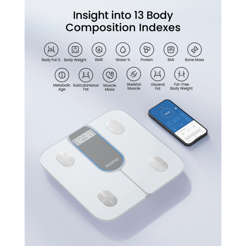 Jūsų asmeninė sveikatos programėlė : „RENPHO Health“ programėlė suteikia prieigą prie 13 svarbiausių kūno rodiklių. Prisijunkite prie svarstyklių per „Bluetooth“ ir stebėkite savo kūno būklę kasdien, kas savaitę, kas mėnesį ar kas metus naudodamiesi aiškiomis ir interaktyviomis diagramomis, kurios padės jūsų sveikatingumo kelyje.