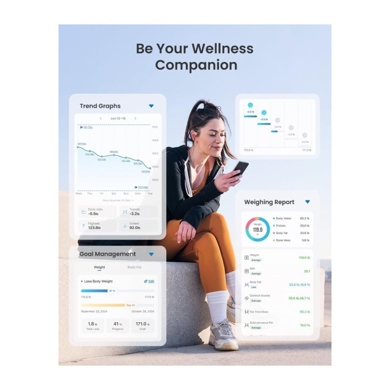 Mūsų išmaniosios svarstyklės siūlo išsamų matavimų spektrą: kūno svorį, KMI (kūno masės indeksą), kūno riebalų procentą, raumenų masę, poodinius riebalus, liesą kūno masę, visceralinį riebalų kiekį, kūno vandens kiekį, kaulų masę, baltymų kiekį ir metabolinį amžių. Jos lengvai sinchronizuojasi su Apple Health, Samsung Health, Fitbit bei MyFitnessPal programėlėmis, suteikdamos visapusišką jūsų sveikatos apžvalgą.