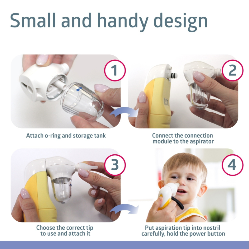 WC-150 automatinis nosies aspiratorius sukurtas jūsų mažylio sveikatai ir komfortui. Šis prietaisas efektyviai pašalina kūdikio nosies sekretą vos per kelias sekundes, padėdamas išvengti infekcijų ir pagreitindamas sveikimą. Paprastas valdymas vienu mygtuku leidžia lengvai naudotis tėvams. 12 gerai žinomų vaikiškų melodijų nukreips kūdikio dėmesį naudojimo metu. Minkšti silikoniniai antgaliai apsaugo nuo bet kokių kūdikio švelnios odos sužeidimų; specialus dizainas užtikrina lengvą priedų nuėmimą ir valymą. Su WC-150 aspiratoriumi jūsų kūdikis kvėpuos lengvai, o jo sveikata bus geresnė.