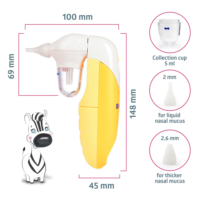 | Komplektacija | Nosies aspiratorius, Antgalis (2vnt.), AA baterijos (2vnt.), Laikymo krepšys, Naudojimo instrukcija. |