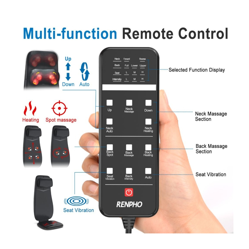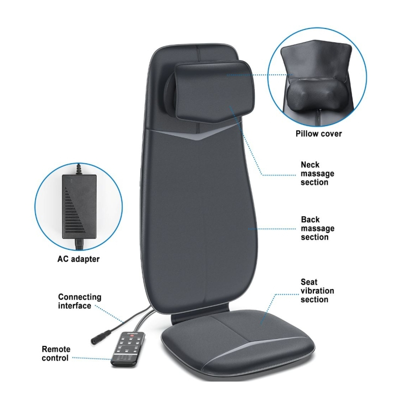 Galimos 4 masažo zonos: viršutinė nugaros dalis, apatinė nugaros dalis, visa nugara ir taškinis masažas. Galima pasirinkti 1 iš 3 reguliuojamų masažo intensyvumo lygių. Taip pat, galima pasirinkti ir iš šildymo funkciją.