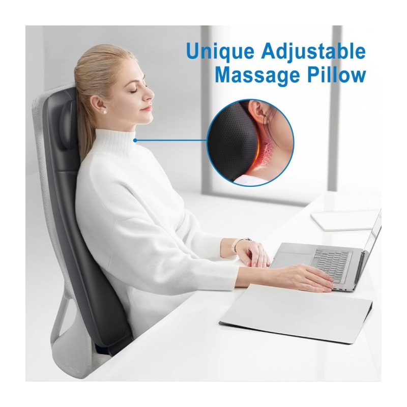 Pagalvėlė turi 4 masažines galvutes, kurios giliai masažuoja kaklą ir pečius. Vertikalus reguliavimas leidžia pritaikyti aukštį daugumai šeimos narių, o apatinės nugaros dalies masažas atpalaiduoja juosmens sritį ir stuburą.