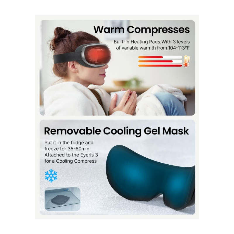 Mėgaukitės 3 reguliuojamais šilumos lygiais (40–45 °C), kurie padeda mažinti paburkimą, akių sausumą ir kt. Nuimama vėsinimo gelio kaukė gali būti laikoma šaldiklyje 35–60 min., o vėliau pritvirtinama prie „Eyeris 3“, kad švelniai sumažintų akių įtampą ir nuovargį. Išplėstos masažo pagalvėlės ir reguliuojama galvos juosta užtikrina individualų ir patogų prigludimą daugumai žmonių.