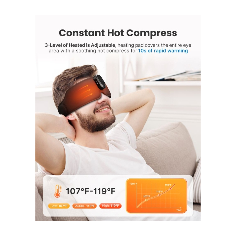 Kaukė turi tris šilto kompreso temperatūros lygius, leidžiančius pasirinkti jums tinkamiausią šilumą. Šilti kompresai švelniai plečia kraujagysles, gerina kraujotaką ir padeda sumažinti akių nuovargį bei sausumo pojūtį. Atsipalaiduokite ir atgaukite jėgas.