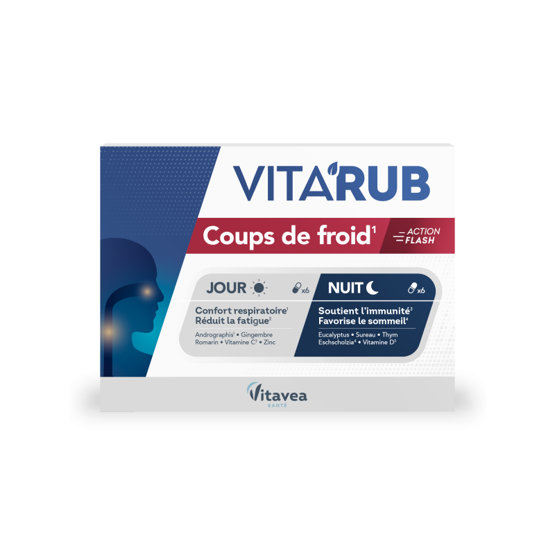 ●KVĖPAVIMO TAKŲ KOMFORTAS ●RAMUS MIEGASVitavea VITA’RUB Coups de Froid skirtas palaikyti organizmo atsparumą šaltuoju metų laiku.Šis maisto papildas derina dvi atskiras – dienos ir nakties – formules, sudarytas iš kruopščiai atrinktų augalinės kilmės medžiagų, vitaminų ir mineralų, padedančių palaikyti normalią imuninės sistemos veiklą ir bendrą savijautą.Rekomenduojama vartoti sezoniniais laikotarpiais, kai organizmas tampa jautresnis aplinkos veiksniams.DIENOS KAPSULĖ●Padeda palaikyti kvėpavimo takų komfortą(1)●Padeda mažinti nuovargį(2)Skėstašakis kamras(1), imbieras(2), rozmarinas, vitaminas C(2), cinkas(3)NAKTIES KAPSULĖ●Padeda palaikyti normalią imuninės sistemos veiklą(3)●Padeda palaikyti ramų miegą(4)Eukaliptas(1), juoduogis šeivamedis(1), vaistinis čiobrelis(1), geltonžiedė ešolcija(4), vitaminas D(3)MAISTINĖS MEDŽIAGOS●Skėstašakis kamras padeda palaikyti normalią kvėpavino takų funkciją, normalią imuninės sistemos veiklą, padeda apsaugoti ląsteles nuo oksidacinės pažaidos*. ●Imbieras padeda palaikyti palaikyti energiją ir gyvybingumą, normalią imuninės sistemos veiklą, normalią širdies veiklą, normalią virškinimo funkciją, padeda apsaugoti ląsteles nuo oksidacinės pažaidos*.●Rozmarinas padeda palaikyti skysčių šalinimą iš organizmo, padeda apsaugoti ląsteles nuo oksidacinės pažaidos*.●Eukaliptas padeda palaikyti normalią kvėpavino takų funkciją*.●Vitaminas D ir cinkas padeda palaikyti normalią imuninės sistemos veiklą. ●Cinkas padeda apsaugoti ląsteles nuo oksidacinės pažaidos.●Juoduogis šeivamedis padeda palaikyti kvėpavimo takų funkciją, padeda palaikyti normalią imuninės sistemos veiklą, padeda apsaugoti ląsteles nuo oksidacinės pažaidos*.●Čiobrelis padeda palaikyti kvėpavimo takų funkciją, normalią virškinimo funkciją, padeda apsaugoti ląsteles nuo oksidacinės pažaidos*.●Geltonžiedė ešolcija, dar vadinama „Kalifornijos aguona“, padeda palaikyti normalią psichologinę funkciją, padeda atsipalaiduoti, padeda esant sutrikusiam miegui, nemigai, nerviniam susijaudinimui, nerimui*.*Teiginiai apie sveikatingumą laukia ES patvirtinimo.1-oje dienos kapsulėje:●Tikrojo imbiero ekstraktas 100 mg ●Vitaminas C 80 mg (100 % RMV*) ●Skėstašakio kamro ekstraktas 80 mg ●Rozmarino ekstaktas 25 mg ●Cinkas 5 mg cinko (50 % RMV*)1-oje nakties kapsulėje:●Juoduogio šeivamedžio ekstraktas 50 mg ●Eukalipto ekstraktas 50 mg ●Vaistinio čiobrelio ekstraktas 50 mg ●Geltončiedės ešolcijos ekstraktas 25 mg ●Vitaminas D 2,5 µg (50 % RMV*)* RMV referencinė maistinė vertė.Maisto papildas. 12 augalinės kilmės kapsulių. Grynasis kiekis 6,23 g.Partijos Nr. ir geriausias iki pabaigos: nurodyta ant pakuotės.Gamintojas: Vitavea, 85612 Montaigu Cedex, PrancūzijGavėjas :