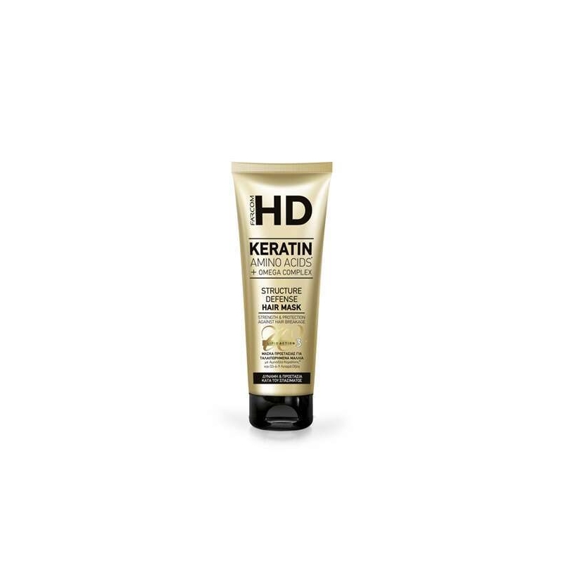 Kaukė Farcom Professional HD Structure Defence Hair Mask skirta plaukams, kuriems reikalinga intensyvi priežiūra. Priemonės sudėtyje yra kondicionuojančių ingredientų: augalinės kilmės keratino amino rūgščių, omega-3, omega-6 ir omega-9, kurios padeda apsaugoti plaukus nuo lūžinėjimo. Sudėtyje esančios amino rūgštys giliai prasiskverbia į plauko vidų ir atkuria natūralaus keratino struktūrą. Apsaugo plaukus nuo priešlaikinio plaukų senėjimo, daro juos minkštus ir suteikia gražaus žvilgesio. Keratinas tai pagrindinė statybinė medžiaga, nuo kurios priklauso plaukų būklė. Kai jo trūksta, plaukai praranda išpuoselėtą išvaizdą, blizgesį, elastingumą, tampa ploni, lūžinėja, pučiasi, o kartais pernelyg veliasi. Sudėtyje esantis keratino kompleksas efektyviai stiprina plaukus, apsaugo juos nuo lūžinėjimo bei padeda išlaikyti natūralų drėgmės balansą. Omega rūgštys ne tik atkuria plaukus bei galvos odos drėgmės pusiausvyrą, bet ir suteikia plaukams spindesio. Šios rūgštys maitindamos plaukų folikulus, stabdo plaukų retėjimą, skatina jų augimą, padeda sustabdyti galiukų lūžinėjimą ir apsaugo juos nuo neigiamo aplinkos poveikio. Omega-3 rūgštys būtinos tam, kad plaukai augtų gražūs ir stiprūs. Farcom Professional HD Structure Defence Hair Mask kaukė akimirksniu atpalaiduoja plaukus, jų neapsunkindama. Plaukai tampa švelnūs ir blizgūs.