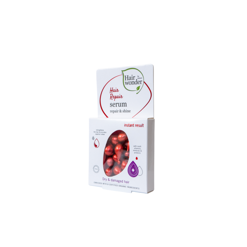 Hairwonder – tai biologiškai aktyvių medžiagų derinys, sukurtas plaukų maitinimui, drėkinimui, stiprinimui ir apsaugai. Šis prekės ženklas jungia gamtą, mokslą ir inovacijas, kad Jūsų plaukai būtų stiprūs, sveiki ir gražūs. Hairwonder produktai yra saugūs ir veiksmingi, jų sudėtyje – ne mažiau kaip 8 kruopščiai atrinkti ekologiški augaliniai ekstraktai, natūraliai turintys vitaminų ir mineralų. Šios veikliosios medžiagos pasižymi vertingomis savybėmis, atkeliavusiomis tiesiai iš gamtos. Produktų patikimumą ir kokybę patvirtina gamintojui suteiktas ISO 22716 aukščiausios kokybės standartas, kuriuo gali pasigirti tik nedaugelis kosmetikos gamintojų. Hairwonder ypač rekomenduojami, jei plaukai nusilpę, lūžinėja, slenka, veliasi ar atrodo nualinti. Tinka visų tipų plaukams. Reguliariai naudojant, plaukai tampa vešlūs, purūs, šilkinio švelnumo, lengvai iššukuojami, blizgantys ir stiprūs – sveiki ir gražūs kiekvieną dieną.HAIRWONDER Serumo kapsulės plaukams, 14 vntKoncentruotas serumas su maitinamosiomis ir kondicionuojančiomis savybėmis, skirtas greitam sausų ir pažeistų plaukų atstatymui. Unikalios formulės dėka sudėtyje esančios medžiagos giliai įsiskverbia į plauko struktūrą ir veikia iš vidaus, atkurdamos sveikus, žvilgančius, švelnius ir lengvai iššukuojamus plaukus. Praturtintas 8 ekologiškais augaliniais ekstraktais, fitokeratinu, provitaminu B5, biotinu, inozitoliu, linoleno rūgštimi, paprastųjų kaštonų ekstraktu, vitaminais E, A ir bioaktyvių magnio, cinko, vario, geležies ir silicio mineralų kompleksu.Hair Wonder serumo kapsulės – dabar dar geresnės!Atnaujinta formulė sukurta pagal naujausius mokslinius tyrimus, o kapsulės dabar yra visiškai veganiškos. Naudojama patentuota „minkšta“ kapsulė, pagaminta iš karegeno (raudonųjų dumblių ekstrakto), kukurūzų krakmolo, dinatrio fosfato ir augalinės kilmės glicerolio. Tai tikra naujovė „minkštų“ kapsulių srityje, nes įprastai jos gaminamos iš gyvūninės želatinos. Be to, kapsulės yra biologiškai suyrančios.SAVYBĖS●Veganinis produktas.●Koncentruotas serumas su maitinamosiomis ir kondicionuojančiomis savybėmis.●Lengva dozuoti.●Greitas poveikis – atkuriami sausi ir pažeisti plaukai.●Sudėtyje didelė veikliųjų medžiagų koncentracija.●Padeda kovoti su plaukų sausumu, pasišiaušimu ir pažeidimais.●Praturtintas 8 ekologiškais augaliniais ekstraktais, fitokeratinu, provitaminu B5, biotinu, inozitoliu, linoleno rūgštimi, paprastųjų kaštonų ekstraktu, vitaminais E, A ir bioaktyvių magnio, cinko, vario, geležies ir silicio mineralų kompleksu.●Daugiau nei 30 metų – olandiškos kokybės ir patikimumo simbolis. Pažangios formulės, tvarumas ir ISO 22716 kokybės garantija. Be mikroplastiko.TURTINGA SUDĖTIS●Fitokeratinas - sudurtinis žodis, kurio pirmoji dalis fito- (gr. phyto) reiškia sąsają su augalais, t.y. fitokeratinas yra augalinis keratinas, išgautas iš trijų šaltinių - hidrolizuotų kviečių, sojos ir kukurūzų baltymų). Tyrimas (1) įrodė, kad fitokeratinas įsigeria į plaukų odelę ir suformuoja apsauginę plėvelę, kuri gali padėti sulaikyti drėgmę ir išlaikyti jos balansą, gali padėti palaikyti plaukų stiprumą, minkštumą ir suteikti natūralaus žvilgesio.●Pantenolis - plaukų kondicionuojamoji medžiaga, palengvina šukavimą, suteikia plaukams elastingumo, švelnumo ir žvilgesio. (2) Pantenolis padeda išlaikyti plaukų drėgmės balansą ir padeda stiprinti plaukus. (3)●Bioaktyvūs magnio, cinko, vario, geležies ir silicio mineralų kompleksai, gauti fermentuojant mieles (Saccharomyces) su šiais mineralais.Varis padeda palaikyti normalią plaukų pigmentaciją, o cinkas – normalią plaukų būklę. Geležies ir silicio kompleksai veikia kaip plaukus kondicionuojančios medžiagos, padeda pritraukti drėgmę ir išlaikyti jos balansą. (2)●Paprastųjų kaštonų ekstraktas padeda pritraukti drėgmę ir išlaikyti jos balansą. (2)●Vitaminai E ir A padeda apsaugoti ląsteles nuo oksidacinės pažaidos.●Inozitolis - plaukų kondicionuojamoji medžiaga, palengvina šukavimą, suteikia plaukams elastingumo, švelnumo ir žvilgesio. Padeda pritraukti drėgmę ir išlaikyti jos balansą. (2)●Biotinas padeda palaikyti normalią plaukų būklę.●Ekologiškų augalų ekstraktų ir žolelių mišinys: vaistinės melisos, kvapiojo rozmarino, aštrialapių kasijų, žaliosios ir raudonosios arbatos lapų, ženšenio šaknų, paprastojo apynio spurgų, vaistinės ramunės žiedų ekstraktai intensyviai prižiūri plaukus ir galvos odą.(1). Fitokeratino poveikis buvo tiriamas „Arch Cosmetic Ingredients & ideas” atliktame tyrime, siekiant įvertinti fitokeratino poveikį chemiškai paveiktų plaukų atsparumui skilinėti ir jų tamprumui. (Techninė tyrimo informacija, versija 11/07/07v1.5, nuoroda: https://slamutis.lt/PDF/Tyrimas-fitokeratinas_slamutis.lt.pdf).(2). NCV (Nederlandse Cosmetica Vereniging = Nyderlandų Kosmetikos Asociacija). https://www.ncv-cosmetica.nl/cosmetica/samenstelling-en-ingredienten/inci-controle/.(3). Tyrimai: Erlemann, Merkle, Panthenol, Phytantriol, Dexpanthenol und Vitamin A in der Kosmetik, SOFW, 117, 379–384 (1991). Erlemann, Merkle, Panthenol, Phytantriol, Dexpanthenol und Vitamin A in der Kosmetik, SOFW, 117, 379–384 (1991).PAPILDOMI PRIVALUMAIPLAUKŲ PRIEŽIŪROS SPECIALISTAS NUO 1985 metų. „Hairwonder“ myli natūraliai sveikus, žvilgančius ir stiprius plaukus. Nuo 1985 m. specializuojamės kurdami produktus, kurie tai padaro įmanoma – priemones, atstatančias, maitinančias ir suteikiančias plaukams natūralaus žvilgesio. Didžiuojamės, kad šiandien mūsų produktai yra pamėgti daugiau nei 35 šalyse, o milijonai žmonių jau patyrė mūsų 100 %-inės olandiškos kokybės rezultatus.ISO STANDARTAS. „Hairwonder“ yra sertifikuota pagal aukščiausios kokybės standartą I