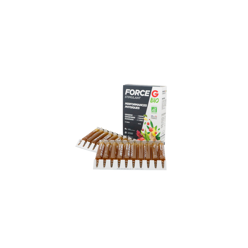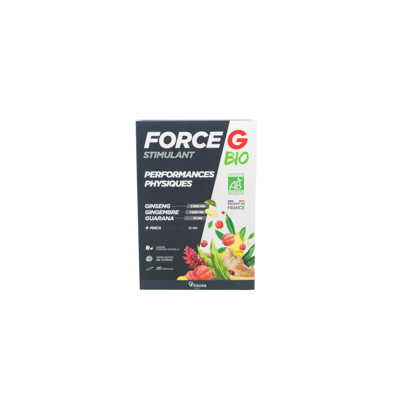 Fiziniam ir seksualiniam tonusui „Force G Stimulant BIO“ 100% natūrali ir ekologiška formulė sujungia gerai žinomus ir pripažintus augalinius ekstraktus - ženšenį, imbierą, gvaraninę pauliniją ir maca (lot. peruvinė pipirnė), siekiant palaikyti jūsų fizinę ir seksualinę veiklą.●Maca (Peruvinė pipirnė) padeda palaikyti seksualinę funkciją, normalų vaisingumą ir reprodukcinę funkciją, normalią psichologinę funkciją, normalią hormoninės sistemos veiklą, padeda palaikyti gyvybingumą.*●Kininiai ženšeniai padeda palaikyti normalią energiją ir gyvybingumą, normalią psichologinę/protinę funkciją, normalią imuninės sistemos veiklą, normalią seksualinę funkciją. * ●Imbiero ekstraktas padeda palaikyti normalią: virškinamojo trakto, imuninės sistemos, širdies veiklą, padeda mažinti diskomforto pojūtį (vėmimas, galvos svaigimas) keliaujant, padeda apsaugoti ląsteles nuo oksidacinės pažaidos. Padeda palaikyti energiją ir gyvybingumą, normalų cukraus kiekį kraujyje, normalią kvėpavimo takų funkciją.*●Gvaraninės paulinijos ekstraktas padeda palaikyti normalią protinę veiklą, normalią riebalų apykaitą, normalų kūno svorį, normalią medžiagų apykaitą ir apsaugą nuo neigiamo streso ir aplinkos poveikio, normalią virškinimo sistemos veiklą.**Teiginiai apie sveikatingumą laukia ES patvirtinimo. 1-oje ampulėje:●Kininio ženšenio ekstraktas : 3500 mg;●Tikrojo imbiero ekstraktas: 1000 mg; ●Gvaraninės paulinijos ekstraktas: 75 mg;●Maca (peruvinės pipirnės) ekstraktas (ekvivalentas) 300 mg, gryno ekstrakto 75 mg;●Natūralios kilmės kofeinas 15 mg;●Koncentruotos citrinų sultys 500 mg.Maisto papildas. 20 ampulių. Grynasis kiekis 200 ml. FR-BIO -01 Ne ES žemės ūkis.Gamintojas: Vitavea, laboratoires Vitarmonyl, 85612 Montaigu, PrancūzijaGavėjas :