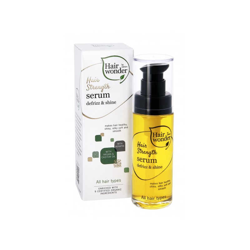 Hairwonder – tai biologiškai aktyvių medžiagų derinys, sukurtas plaukų maitinimui, drėkinimui, stiprinimui ir apsaugai. Šis prekės ženklas jungia gamtą, mokslą ir inovacijas, kad Jūsų plaukai būtų stiprūs, sveiki ir gražūs. Hairwonder produktai yra saugūs ir veiksmingi, jų sudėtyje – ne mažiau kaip 8 kruopščiai atrinkti ekologiški augaliniai ekstraktai, natūraliai turintys vitaminų ir mineralų. Šios veikliosios medžiagos pasižymi vertingomis savybėmis, atkeliavusiomis tiesiai iš gamtos. Produktų patikimumą ir kokybę patvirtina gamintojui suteiktas ISO 22716 aukščiausios kokybės standartas, kuriuo gali pasigirti tik nedaugelis kosmetikos gamintojų. Hairwonder ypač rekomenduojami, jei plaukai nusilpę, lūžinėja, slenka, veliasi ar atrodo nualinti. Tinka visų tipų plaukams. Reguliariai naudojant, plaukai tampa vešlūs, purūs, šilkinio švelnumo, lengvai iššukuojami, blizgantys ir stiprūs – sveiki ir gražūs kiekvieną dieną.Išskirtinė plaukų priežiūra su aktyviu keratinu – įrodyta, kad plaukai tampa stipresni.Unikali „Hair Strenght“ produktų linija, sukurta stipriems ir sveikiems plaukams. Šeši produktai su koncentruotu aktyvaus keratino deriniu iš hidrolizuoto keratino, keratino ir oksiduoto keratino. Šiame derinyje yra amino rūgštys, kurios jungiasi prie plauko sudėtyje esančio keratino ir atstato pažeistą baltyminę plauko struktūrą. Plaukai tuoj pat sustiprėja, tampa elastingi, švelnūs, minkšti it šilkas ir įgauna kerintį žvilgesį. Šis derinys yra gamintojo užpatentuotas ir jo veiksmingumas patvirtintas įrodymais. Kadangi „Hair Strengt“ priemonių sudėtyje yra didelė aktyvaus keratino derinio koncentracija, jos ypač greitai ir veiksmingai užpildo keratino, esančio plaukų sudėtyje, trūkumą. Tyrimai parodė, kad jei plaukų priežiūrai naudojamas šis veiksmingas patentuotų keratinų derinys, tikimybė, kad plaukai bus pažeisti yra mažesnė nei 55%. „Hair Strengt“ produktai praturtinti provitaminu B5, ekologišku argano aliejumi, taukmedžio sviestu, ricinų aliejumi ir 9 ekologiškais augalų ir žolelių ekstraktais. HAIRWONDER „HAIR STRENGTH“ serumas plaukams, 30 mlKoncentruotas, intensyviai maitinantis serumas. Suteikia nepaklusniems plaukams švelnumo, glotnumo, žvilgesio, lengvumo iššukuojant ir padeda išvengti pasišiaušimo. Su aktyviuoju keratinu, 9 sertifikuotais ekologiškais ingredientais, argano ir ricinų aliejais.SAVYBĖS●Drėkina ir atkuria plaukus.●Padeda suvaldyti pasišiaušusius plaukus.●Suteikia plaukams švelnumo ir šilkinio glotnumo.●Palengvina plaukų iššukavimą.●Apsaugo nuo karščio poveikio formuojant plaukus.●Tinka visų tipų plaukams.●Tinka ir dažytiems plaukams.●Itin ekonomiškas – pakanka vos vieno lašo vienam naudojimui.●Sudėtyje net 9 sertifikuoti ekologiški ingredientai, aktyvus keratinas, argano ir ricinų aliejai●Tinka kasdieniam naudojimui arba kai plaukams reikia papildomos priežiūros. Ypač patariama naudoti, kada plaukai yra labiausiai pažeidžiami, pavyzdžiui, vasarą ar keičiantis sezonams.●Malonaus kvapo, kurį suteikia apelsininio citrinmedžio, beržų, pelyno žiedų aliejai ir vanilė.●Daugiau nei 30 metų – olandiškos kokybės ir patikimumo simbolis. Pažangios formulės, tvarumas ir ISO 22716 kokybės garantija. Be mikroplastiko.TURTINGA SUDĖTIS●Aktyvus patentuotas keratinų derinys iš hidrolizuoto keratino, keratino ir oksiduoto keratino sustiprina plaukus ir gerina jų būklę. Keratino lygis nurodytas ant produktų pakuočių. Jis svyruoja nuo 1 iki 20 ir apskaičiuojamas pagal patentuoto keratino kiekį produktuose. Lygis 20 reiškia didžiausią aktyviojo keratino koncentraciją. Šampūnas – lygis 1, kondicionierius – lygis 2, nenuplaunamas kondicionierius – lygis 2, kaukė – lygis 4, keratino purškiklis – lygis 20.*●Argano ir ricinų aliejai maitina, drėkina ir puoselėja plaukus. (1)●Ekologiškų augalų ekstraktų ir žolelių mišinys: vaistinės melisos, kvapiojo rozmarino, aštrialapių kasijų, žaliosios ir raudonosios arbatos lapų, ženšenio šaknų, paprastojo apynio spurgų, vaistinės ramunės žiedų ekstraktai intensyviai prižiūri plaukus ir galvos odą.(1) NCV (Nederlandse Cosmetica Vereniging = Nyderlandų Kosmetikos Asociacija). https://www.ncv-cosmetica.nl/cosmetica/samenstelling-en-ingredienten/inci-controle/.PAPILDOMI PRIVALUMAIPLAUKŲ PRIEŽIŪROS SPECIALISTAS NUO 1985 metų. „Hairwonder“ myli natūraliai sveikus, žvilgančius ir stiprius plaukus. Nuo 1985 m. specializuojamės kurdami produktus, kurie tai padaro įmanoma – priemones, atstatančias, maitinančias ir suteikiančias plaukams natūralaus žvilgesio. Didžiuojamės, kad šiandien mūsų produktai yra pamėgti daugiau nei 35 šalyse, o milijonai žmonių jau patyrė mūsų 100 %-inės olandiškos kokybės rezultatus.ISO STANDARTAS. „Hairwonder“ yra sertifikuota pagal aukščiausios kokybės standartą ISO 22716. Šis standartas apima visapusišką kosmetikos gaminio kokybės ir saugos vadybą nuo gamybos pradžios, t.y. ekologiškų augalų auginimo, gavybos, gabenimo, sandėliavimo iki galutinio produkto išsiuntimo vartotojui. NUOLATINĖS INOVACIJOS, ĮKVĖPTOS GAMTOS. „Hairwonder“ produktams naudojame aukščiausios kokybės ingredientus, vertingus ekstraktus ir pažangius gamybos metodus. „Hairwonder“ yra pirmasis ir vienintelis plaukų priežiūros prekės ženklas, kurio visi produktai praturtinti bent 8 sertifikuotais ekologiškais ingredientais. Šie ingredientai auginami nenaudojant pesticidų.BE MIKROPLASTIKO. Mikroplastikai yra mažos plastiko dalelės, kurios tampa vis didesne problema. Naudojimo metu, kartu su vandeniu, šios mikroplastiko dalelės patenka į vandenyną. Vandens valymo sistemos nepajėgia išfiltruoti šių dalelių iš vandens, todėl, pavyzdžiui, po maudymosi duše, į aplinką pasklinda apie 100 000 mikroplastik
