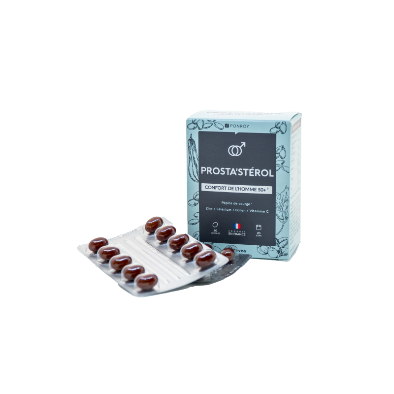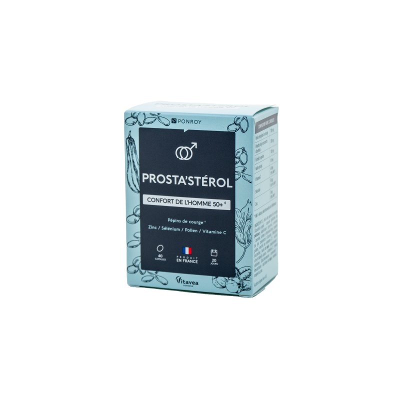 ATNAUJINTA PAKUOTĖProsta‘sterol Vyrų 50+ komfortuiMAISTINĖS MEDŽIAGOS●Moliūgų sėklų aliejus padeda palaikyti normalią šlapimo pūslės funkciją vyrams. ●Selenas padeda palaikyti normalią: spermatogenezę, imuninės sistemos, skydliaukės veiklą . ●Cinkas padeda palaikyti normalų vaisingumą ir reprodukciją, baltymų sintezę, normalią testosterono koncentraciją kraujyje. ●Vitaminas C, selenas ir cinkas padeda apsaugoti ląsteles nuo oksidacinės pažaidos. ●Sudėtį papildo žiedadulkių ekstraktas, sojų aliejus, kraštuotosios malpigijos sulčių koncentrato milteliai, kuriuose yra vitamino C.2-ose kapsulėse: ●Moliūgų sėklų aliejus 705 mg; ●Žiedadulkių ekstraktas 100 mg; ●Kraštuotosios malpigijos sulčių koncentrato milteliai 200 mg; ●Sojų aliejus 85 mg; ●Vitaminas C 60 mg (75 % RMV*); ●Cinkas 5 mg (50% RMV*); ●Selenas 50 µg (90,9% RMV*).*RMV – referencinė maistinė vertė.Maisto papildas. 40 kapsulių. Grynasis kiekis 35,2 g. Gamintojas: IRB Yves Ponroy, 85612 Montaigu Cedex, Prancūzija. Daugiau apie produktą:Patvirtintas veiksmingumas (tyrimas PRO/CAO196), kuriame dalyvavo 40 vyrų nuo 50 iki 75 metų. Po 3 mėnesių šio preparato vartojimo pastebėti pokyčiai:77,5 % vyrų pagerėjo naktinis šlapinimasis,62,5 % vyrų pagerėjo dieninis šlapinimasis,75 % vyrų sutrumpėjo šlapinimosi laikas, 82,5 % vyrų pagerėjo pūslės ištuštėjimas.Gavėjas :