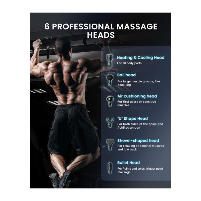 Pasirinkite iš 6 profesionalių masažo galvučių, skirtų skirtingoms raumenų grupėms, ir reguliuokite masažo intensyvumą nuo 1 iki 6 lygio (1800 – 2600 RPM), kad tiksliai palengvintumėte raumenų įtampą.