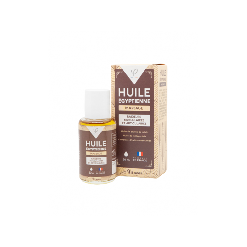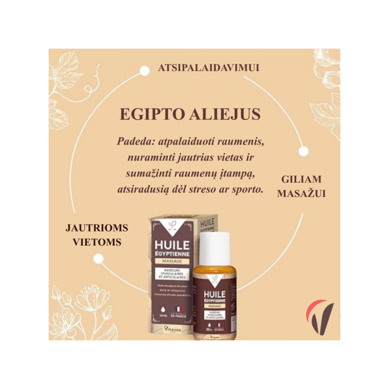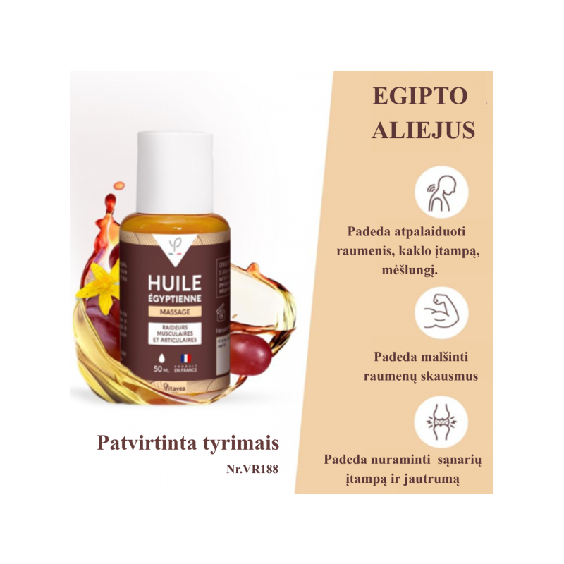 Vitavea Egipto aliejus atpalaiduojančiam masažui 100% natūralios kilmės.MASAŽUI.SUSTINGUSIEMS RAUMENIMS IR SĄNARIAMS.SKIRTA●Giliam viso kūno masažui po fizinio krūvio arba naudojimui jautriose zonose.●Padeda suminkštinti raumenis, palengvinti varginančias apraiškas (mėšlungis, sprando sustingimas…), atpalaiduoti raumenų įtampą po sporto, stovimo darbo, sodo darbų…●Visai šeimai. Suaugusiems, senjorams, sportininkams, vaikams nuo 12 metų amžiaus.●Ypač populiarus tarp masažuotojų ir sportininkų, kineziterapiautų naudojamas daugiau kaip 30 metų.AKTYVIOSIOS MEDŽIAGOS●Egipto aliejaus veiksmingumas pagrįstas deguonimi prisotinto (hiperoksigenizuoto*) kukurūzų, tikrųjų vynmedžių sėklų ir jonažolių aliejų privalumais.●Apelsininio citrinmedžio žievelių, tikrosios levandos, blakinės kalendros, dirvinės mėtos lapų, tikrojo miramedžio esencijomis kvepiantis aliejus itin maloniai maitina ir minkština odą, netepdamas drabužių.*Hiperoksigenizuotas aliejus – tai deguonimi prisotintas aliejus, padedantis geriau aprūpinti audinius deguonimi, greičiau susigeriantis ir padedantis atsiskleisti veikliųjų medžiagų poveikiui. PASKIRTIS●Giliam viso kūno masažui po fizinio krūvio arba atskirų, jautrių kūno vietų masažui.●Puikus visiems, norintiems atpalaiduojančio kūno masažo.REKOMENDUOJAMA NAUDOTI●Lengvai masažuojant raumenis, sąnarius ir jautrias vietas, 2–3 kartus per dieną.●Gali būti naudojamas vyresniems nei 12 metų vaikams ir paaugliams, po intensyvios fizinės veiklos.ĮRODYTAS EFEKTYVUMAS●Tyrimas, atliktas bendradarbiaujant su Prancūzijos olimpiniu komitetu:80 % teigiamų rezultatų šalinant raumenų ir sąnarių varginančias apraiškas, sukeltus uždegimų ir traumų. Poveikis pastebimas po 48 valandų.●Tyrimas, atliktas su Opéra de Paris šokėjais:80% respondentų šį aliejų įvertino geriau nei kitus. Puikiai toleruojamas, jokių sudirginimo požymių.●Tyrimas (Nr.VR188) atliktas tarptautinių varžybų metu su 40 aukšto lygio sportininkų:Nuo antros dienos naudojimo esant raumenų sąstingiui – 84% patenkintų vartotojų, esant varginančioms apraiškoms -72,5 % patenkintų vartotojų.PRODUKTO PRANAŠUMAI●100% natūralios kilmės.●Greitas poveikis. Puikiai toleruojamas, jokių sudirginimo požymių.●Įrodytas efektyvumas.●Malonaus kvapo, lengva naudoti – lengvai pasiskirsto, geros masažuojamosios savybės, dėl tinkamo klampumo yra skalsus.●Nepalieka dėmių ant drabužių.●Kineziterapiautai naudoja daugiau kaip 30 metų.Pakuotė: 50 mlGamintojas: Vitavea, Parc d’activité Sud Loire – 85612 Montaigu Cedex – PrancūzijGavėjas :