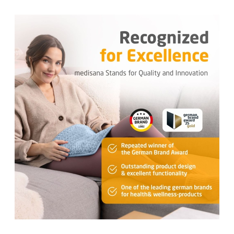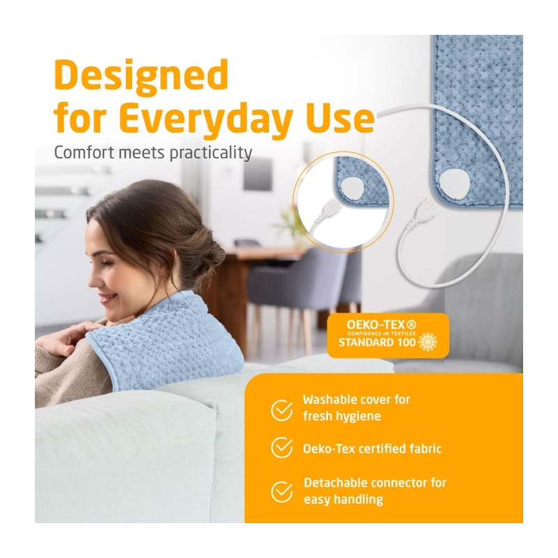 Automatinis išsijungimas po 90 minučių užtikrina saugų šildymo pagalvėlės naudojimą. Integruota apsauga nuo perkaitimo suteikia papildomą saugumą. Šildymo pagalvėlė užtikrina saugų ir komfortišką šildymą, o Oeko-Tex Standard 100 sertifikatas patvirtina medžiagų patikimumą.