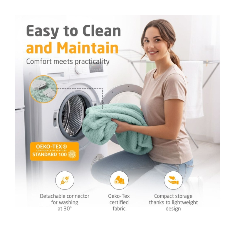 Šildoma paklodė yra pagaminta iš aukštos kokybės poliesterio ir pasižymi aksominiu, minkštu paviršiumi, suteikiančiu unikalų jaukumo pojūtį. Nuimamas valdymo pultelis leidžia skalbti paklodę 30 °C temperatūroje. Prietaisas yra sertifikuotas pagal Oeko-Tex Standard 100 ir prieinamas keturiomis madingomis spalvomis – mėlyna, pilka, žalia ir violetinė, todėl dera prie bet kokio interjero.