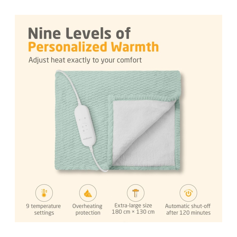 Galima pasirinkti vieną iš 9 šilumos lygių, kad šildoma paklodė tobulai atitiktų individualius poreikius. Nesvarbu, ar pageidaujate švelnios šilumos, ar stipresnio šildymo, šildoma paklodė užtikrina optimalų komfortą bet kurioje situacijoje. Dėl savo didelio dydžio (180 × 130 cm), šildoma paklodė Medisana HB 415 puikiai tinka tiek naudotis vienam, tiek dalintis su partneriu.