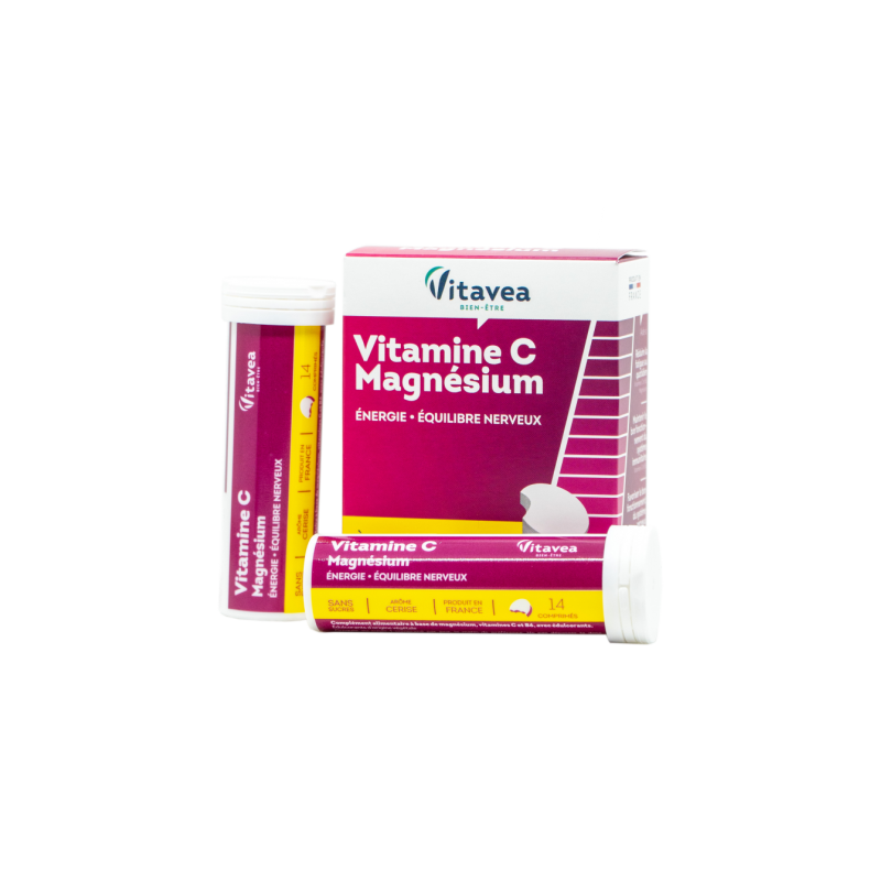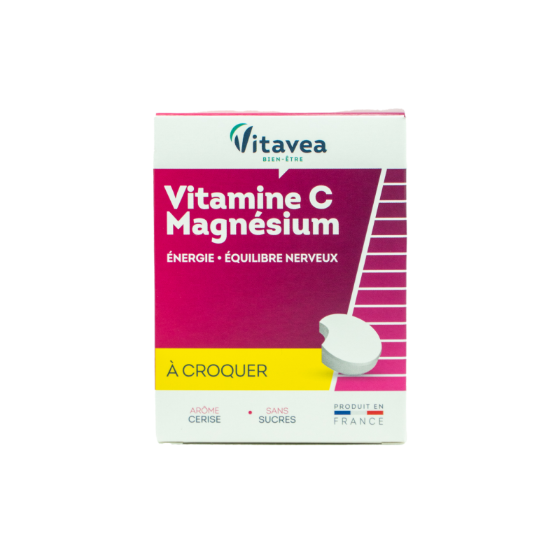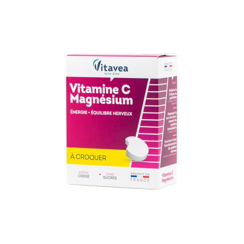 Vitaminai C, B6 ir magnisBe pridėtinio cukraus, malonaus vyšnių skonio.Padeda atgauti energiją ir skatina atsipalaidavimą.MAISTINĖS MEDŽIAGOS●Padeda palaikyti normalią nervų sistemos veiklą ir psichologinę funkciją (vitaminai C, B6, magnis).●Padeda mažinti pavargimo jausmą ir nuovargį (vitaminai C, B6 ir magnis).●Padeda palaikyti normalią imuninės sistemos veiklą (vitaminai C, B6).●Padeda palaikyti normalią kaulų, dantų būklę, raumenų funkciją (magnis).●Padeda palaikyti normalią energijos apykaitą (vitaminas B6, C, magnis).1-oje tabletėje:●Vitaminas C 180 mg (225 % RMV*)●Vitaminas B6 1,4 mg (100 % RMV*)●Magnis 187,5 mg (50 % RMV*) *RMV referencinė maistinė vertė. Maisto papildas. 28 tabletės. Grynasis kiekis 70 g. Su saldikliu.Gamintojas: Vitavea - Laboratoires Yves Ponroy, Parc d'activité Sud Loire - 85612 Montaigu Cedex – Prancūzija.Gavėjas :