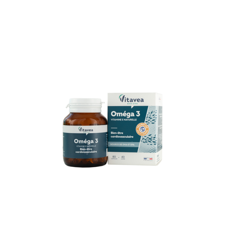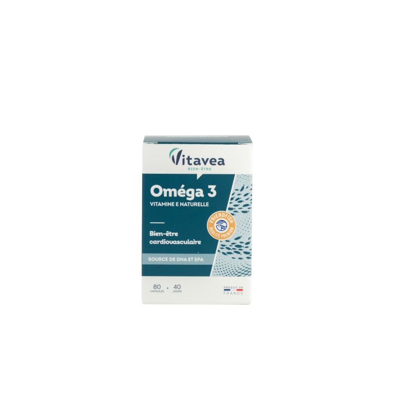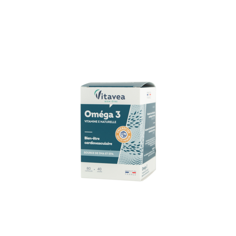 VITAVEA OMEGA 3 su natūralios kilmės vitaminu ESvarbus duetas širdies ir kraujagyslių sistemos gerovei: Omega 3 ir natūralus vitaminas E. Mažose, lengvai nuryjamose kapsulėse.Paženklinta "FRIENDFISH“ ("JŪROS DRAUGO") sertifikatu. Tai garantuoja 3 pagrindinius gamintojo įsipareigojimus: 1. aukščiausios kokybės aliejus.2. išgaunamas iš smulkių laukinių žuvų, laikantis tvarios ir atsakingos žvejybos principų.3. aliejus yra pakuotėse, kurios garantuoja optimalų omega 3 rūgščių išsaugojimą - kapsulės yra tamsaus stiklo buteliukuose. Stiklas neturi sąveikos su aplinka, todėl į gaminį nepatenka oras, drėgmė, dulkės ir kitos medžiagos, galinčios pakenkti produkto kokybei. Tamsaus stiklo buteliukuose laikomi produktai išlieka aukštesnės kokybės ir stabilūs, yra apsaugomi nuo neigiamo šviesos poveikio ir priešlaikinės oksidacijos. AKTYVIOSIOS MEDŽIAGOS●EPR ir DHR padeda palaikyti normalią širdies veiklą**. ●DHR padeda palaikyti normalią smegenų funkciją, išsaugoti normalų regėjimą*.●Vitaminas E padeda apsaugoti ląsteles nuo oksidacinės pažaidos.**teigiamas poveikis pasireiškia per parą suvartojant 250 mg DHR ir EPR.*teigiamas poveikis pasireiškia per parą suvartojant 250 mg DHR.2-ose kapsulėse: ● Žuvų taukai 729 mg, kuriuose Omega 3 rūgštys 386,4 mg, kuriose : EPR 211,4 mg, DHR 138,6 mg ; ●Vitaminas E 10 mg α-TE (83,4% RMV*)RMV*- referencinė maistinė vertė.Maisto papildas. 80 kapsulių. Grynasis kiekis 44,6 g. Gaminio informacija, susijusi su produkto kokybe ir aplinkosaugos savybėmis: Perdirbtos medžiagos procentinė dalis pakuotėje: gaminyje nėra perdirbtų medžiagų.Pavojingų medžiagoų buvimas pakuotėje: nėra. Pavojingos medžiagos buvimas gaminyje: nėra. Pakuotės perdirbamumas: perdirbama. Gamintojas: Vitavea - Laboratoires Yves Ponroy, Parc d'activité Sud Loire - 85612 Montaigu Cedex – PrancūzijGavėjas :