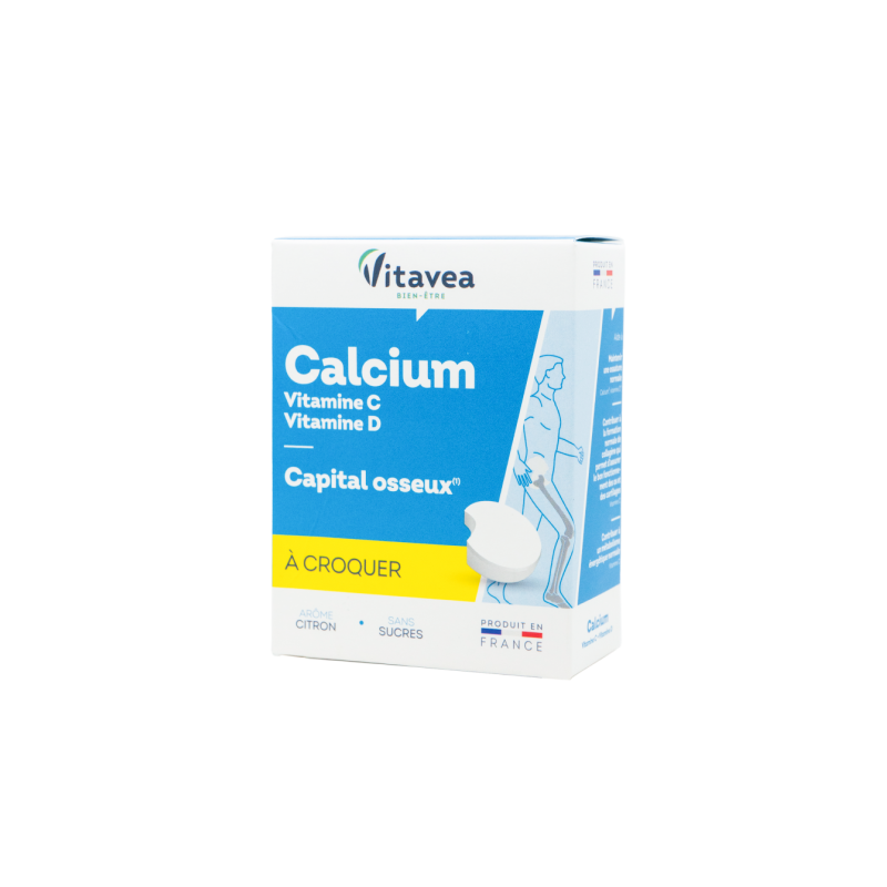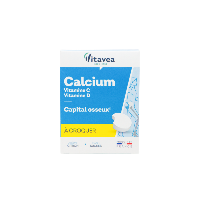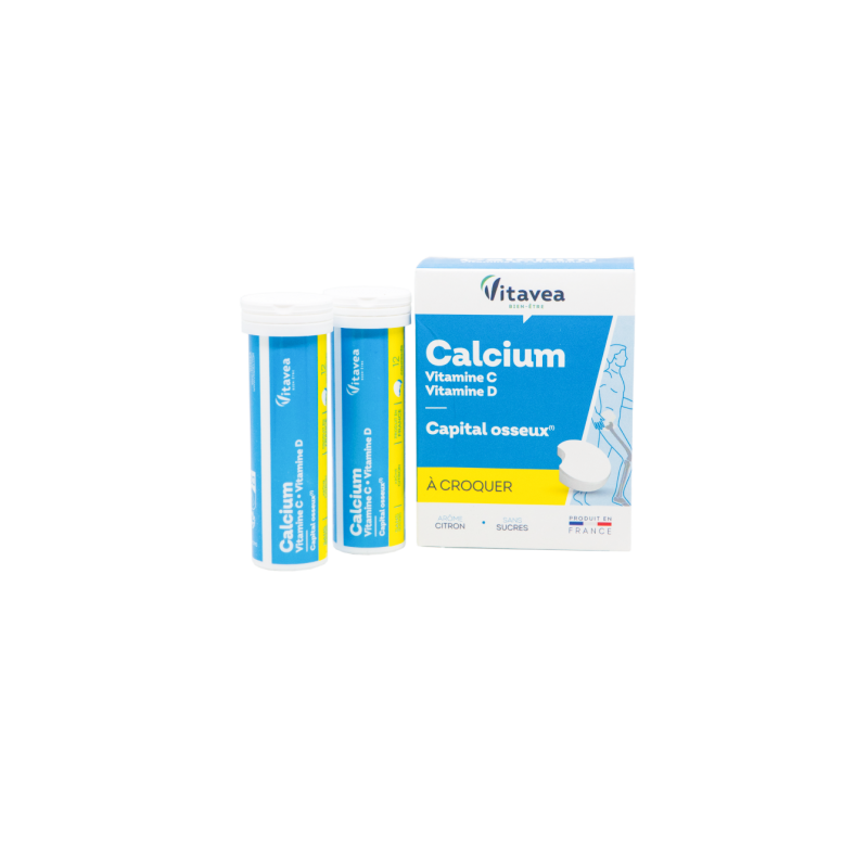 Vitavea Kalcis + vitaminai C ir D3Patenkina kasdienius organizmo poreikius normaliai kaulų būklei palaikyti. Padeda atgaivinti organizmą, mažinti pavargimo jausmą ir nuovargį, padeda palaikyti normalią imuninės sistemos veiklą dėl sudėtyje esančio veiksmingo vitamino C, kalcio ir vitamino D derinio.●Be cukraus. ●Kramtomosios tabletės.●Puikaus citrinų skonio.●Patenkina kasdienius organizmo poreikius.●Pagaminta Prancūzijoje, Vitavea laboratorijoje Vandėja regione, laikantis geros gamybos praktikos (GGP) ir kokybės (ANSM - Nacionalinės vaistų ir sveikatos produktų saugos agentūros) procesų. MAISTINĖS MEDŽIAGOS●Vitaminas C padeda palaikyti kolageno, kuris reikalingas normaliai kaulų, kremzlių, dantų, kraujagyslių, dantenų, odos funkcijoms, susidarymą. Padeda palaikyti normalią imuninės sistemos veiklą, padeda apsaugoti ląsteles nuo oksidacinės pažaidos, padeda palaikyti normalią energijos apykaitą, padeda mažinti pavargimo jausmą ir nuovargį. Padeda palaikyti normalią nervų sistemos veiklą ir psihologinę funkciją. Padeda palaikyti kolageno, kuris reikalingas normaliai kraujagyslių, kaulų, kremzlių, dantenų, odos, dantų funkcijoms, susidarymą. ●Kalcis reikalingas normaliai kaulų ir dantų būklei. Padeda palaikyti normalią: energijos apykaitą, raumenų veiklą, normalų virškinimo fermentų veikimą ir normalų kraujo krešėjimą, normalų nervų impulso perdavimą. ●Vitaminas D padeda palaikyti: normalią kalcio ir fosforo absorbciją ir (arba) įsisavinimą, normalią kalcio koncentraciją kraujyje, normalią: kaulų būklę, raumenų funkciją, dantų būklę, imuninės sistemos veiklą. Vitaminas D atlieka tam tikrą funkciją ląstelių dalijimosi procese.1-oje tabletėje: ●Vitaminas C 180 mg (225% RMV*)●Kalcis 200 mg (25% RMV*)●Vitaminas D 5 µg (100% RMV*) *RMV – referencinė maistinė vertė.Maisto papildas. Su saldikliais. 24 citrinų skonio kramtomos tabletės. Grynasis kiekis 60 g.Gamintojas: Vitavea - Laboratoires Yves Ponroy, Parc d'activité Sud Loire - 85612 Montaigu Cedex, PrancūzijGavėjas :