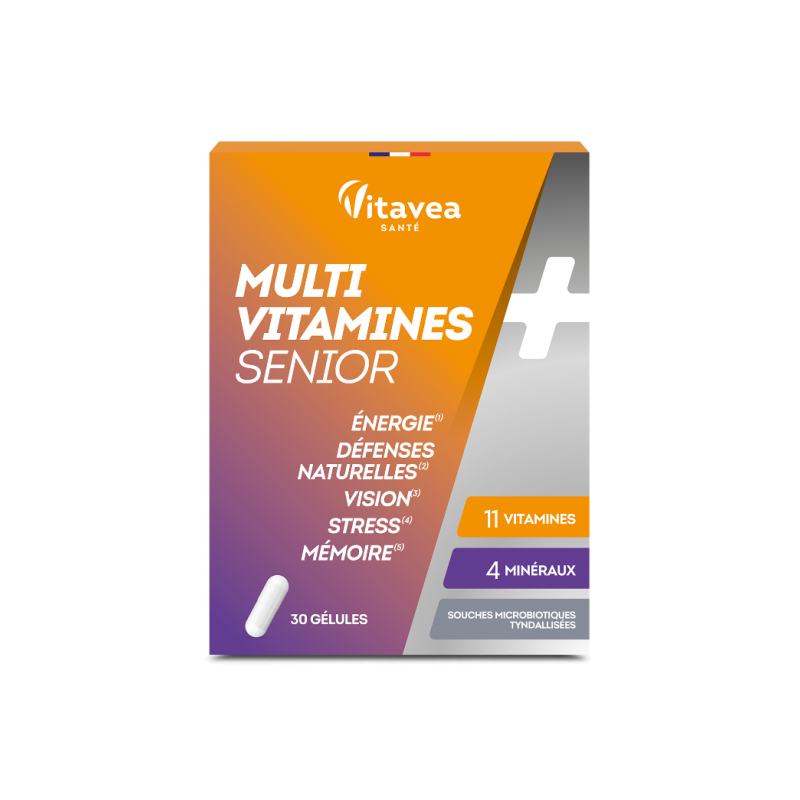 Lactobacillus probiotikų padermės.●11 VITAMINŲ ●4 MIKROELEMENTAI ●MĖLYNIŲ EKSTRAKTAS ●TINDALIZUOTOS PROBIOTIKŲ PADERMĖSMAISTINĖS MEDŽIAGOS●ENERGIJA → Vitaminai C, B2, B3, B5, B6, B9, B12, geležis●NATŪRALI APSAUGA → Vitaminai C, D, B6, B9, B12, geležis, cinkas, varis●REGĖJIMAS → Vitaminas B2, mėlynės●STRESAS → Vitaminai C, B1, B2, B3, B6, B8, B12, varis●ATMINTIS → Cinkas PRODUKTO PRIVALUMAI ●Specialiai pritaikyta senjorų poreikiams.●Lengvai nuryjamos augalinės kilmės kapsulės. ●Turtinga mitybinė formulė.●Pagaminta Prancūzijoje, Vitavea laboratorijoje Vandėja regione, laikantis geros gamybos praktikos (GGP) ir kokybės (ANSM - Nacionalinės vaistų ir sveikatos produktų saugos agentūros) procesų. 1-oje kapsulėje●Paprastųjų mėlynių ekstraktas 50 mg●Vitaminas D 5 µg (100 % RMV*)●Vitaminas E 12 mg mg α-TE (100% RMV*)● Vitaminas C 80 mg (100% RMV *)●Vitaminas B1 1,1 mg (100% RMV *)● Vitaminas B2 1,4 mg (100% RMV *) ●Vitaminas B3 16 mg NE (100% RMV *) ●Vitaminas B5 6 mg (100% RMV *) ●Vitaminas B6 1,4 mg (100 % RMV *) ●Vitaminas B8 50 µg (100 % RMV *)●Vitaminas B9 200 µg (100 % RMV *) ●Vitaminas B12 2,5 µg (100 % RMV *) ●Geležis 7 mg (50% RMV *) ●Cinkas 5 mg (50 % RMV*)●Varis 1 mg (100 % RMV*)●Molibdenas 50 µg (100 % RMV*)●Tindalizuotos Lactobacillus probiotikų padermės 16.7 mg*RMV – referencinė maistinė vertėMaisto papildas 30 augalinės kilmės kapsulių Grynasis kiekis 15.9 gPartijos Nr. ir „Geriausias iki pabaigos“: nurodyta ant pakuotės.Pakuotės kokybės ir aplinkosaugos charakteristikos: Perdirbtos medžiagos naudojimas pakuotėje: 0 %Pavojingos medžiagos pakuotėje: nėraProdukte esančios pavojingos medžiagos: nėraKompostuojama pakuotė: ne (lizdinė ploštelė)Pakuotė: dažniausiai perdirbama (popierinė dėžutė)Gamintojas: Vitavea,85612 Montaigu Cedex – Prancūzija.