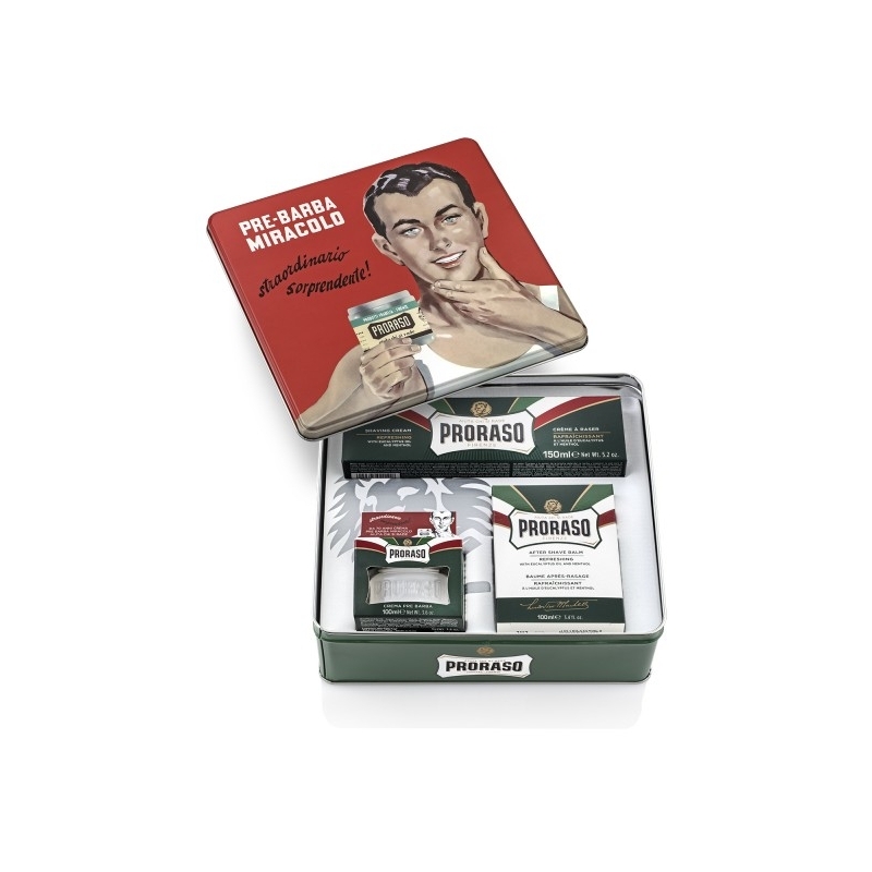„Proraso“ – vienas iš daugiausiai skutimosi priemonių parduodančių gamintojų pasaulyje. Metalinėje vintažinio stiliaus dėžutėje supakuotam „Gino“ rinkiniui gamintojas parinko gaivinančias eukalipto ir mentolio skutimosi priemones iš klasikinės linijos.Rinkinį sudaro:Gaivinantis kremas prieš skutimąsi, 100 mlGaivinantis skutimosi kremas, 150 mlGaivinantis balzamas po skutimosi, 100 mlKAIP NAUDOTIS:Gaivinantis kremas prieš skutimąsi, 100 ml (Naudojimas: prieš skutimąsi sudrėkinkite veidą ir riešuto dydžio priemonės kiekiu padenkite norimas skusti vietas. Kremas suminkštins barzdos plaukus. Skutimąsi tęskite naudodami įprastas skutimosi priemones – kremą, balzamą ar putas.)Gaivinantis skutimosi kremas, 150 ml (Naudojimas: išspauskite apie 2 cm kremo ant skutimosi šepetėlio šerelių. Denkite odą sukamaisiais judesiais sudarydami minkštą ir purią putą. Kremas suminkština barzdos plaukelius ir paruošia odą skutimui. Gali būti naudojamas ir be skutimosi šepetėlio.)- Gaivinantis balzamas po skutimosi, 100 ml (Naudojimas: nedidelį kiekį priemonės delnais įtrinkite į veidą ir masažuokite odą)Gavėjas :