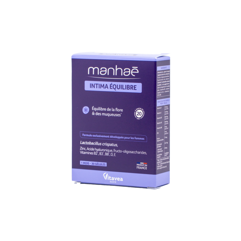 Vitavea Manhaé Intima Equilibre makšties mikrofloros ir gleivinės balansui Makšties florą sudaro keli milijardai gyvų mikroorganizmų, daugiausia laktobacilų, kurios, kaip ir gleivinės drėkinimas, atlieka esminį vaidmenį saugant intymią sferą. Hormonų ir pH svyravimai (menstruacinis ciklas, po gimdymo, menopauzė ir kt.), taip pat išorinės priežastys (netinkamos intymios higienos priemonės, hormoninė kontracepcija, tam tikri vaistai, stresas ir kt.) gali turėti įtakos makšties floros ir gleivinės pusiausvyrai ir tai gali sukelti kasdienį sausumo ir diskomforto jausmą. Manhaé Intima Equilibre – tai sprendimas, padedantis išlaikyti intymų moters komfortą. Manhaé Intima Equilibre formulėje esančios pieno rūgšties bakterijos Lactobacillus crispatus padeda subalansuoti makšties florą. Formulę papildo vitaminai B2, B3, B8, cinkas, hialurono rūgštis ir frukto-oligosacharidai, kurie yra mikrofloros maisto šaltinis.Maistinės medžiagos●2 milijardai Lactobacillus crispatus - makšties floros subalansavimui.●Frukto-oligosacharidai - tai prebiotikai, makšties bakterijų mitybai ir dauginimuisi reikalinga maistinė medžiaga.●Hialurono rūgštis yra viena iš pagrindinių odos sudedamųjų dalių. Ji turi išskirtinį gebėjimą sulaikyti vandenį ląstelėse, taip skatinant odos elastingumą. ●Vitaminas D padeda palaikyti normalią imuninės sitemos veiklą, atlieka tam tikrą funkciją ląstelių dalijimosi procese.●Cinkas padeda palaikyti normalią nervų sistemos veiklą, normalią psichologinę funkciją, padeda atstatyti redukuoto pavidalo vitaminą E, padeda mažinti pavargimo jausmą ir nuovargį.●Vitaminai B2, B3, B8 padeda palaikyti normalią gleivinių ir odos būklę, normalią nervų sistemos veiklą, vitaminai B2 ir B3 padeda mažinti pavargimo jausmą ir nuovargį, vitaminas B3 padeda palaikyti normalią psichologinę funkciją.●Cinkas, vitaminai E ir B2 padeda apsaugoti ląsteles nuo oksidacinės pažaidos.1-oje kapsulėje:●Lactobacillus crispatus: 2 milijardai KSV** gyvybingų pieno rūgšties bakterijų gamybos metu●Natrio hialuronatas: 22,22 mg, kuriame hialurono rūgšties: 20 mg●Frukto-oligosacharidai: 75 mg●Vitaminas D: 3,25 µg (65 % RMV*) ●Vitaminas E: 7,20 mg (60 % RMV*) ●Vitaminas B2: 0,84 mg (60 % RMV*)●Vitaminas B3: 9,60 mg (60 % RMV*) ●Vitaminas B8: 30 µg (60 % RMV*) ●Cinkas: 5 mg (50 % RMV*)RMV*- referencinė maistinė vertė. KSV**- kolonijas sudarančių vienetųMaisto papildas. 30 augalinės kilmės kapsulių. Grynasisi kiekis 9,6 g. Gamintojas: Vitavea - Laboratoires Yves Ponroy, Parc d'activité Sud Loire - 85612 Montaigu Cedex, PrancūzijGavėjas :