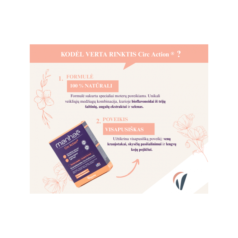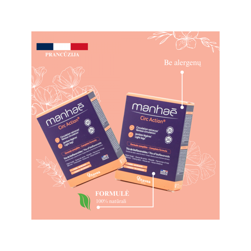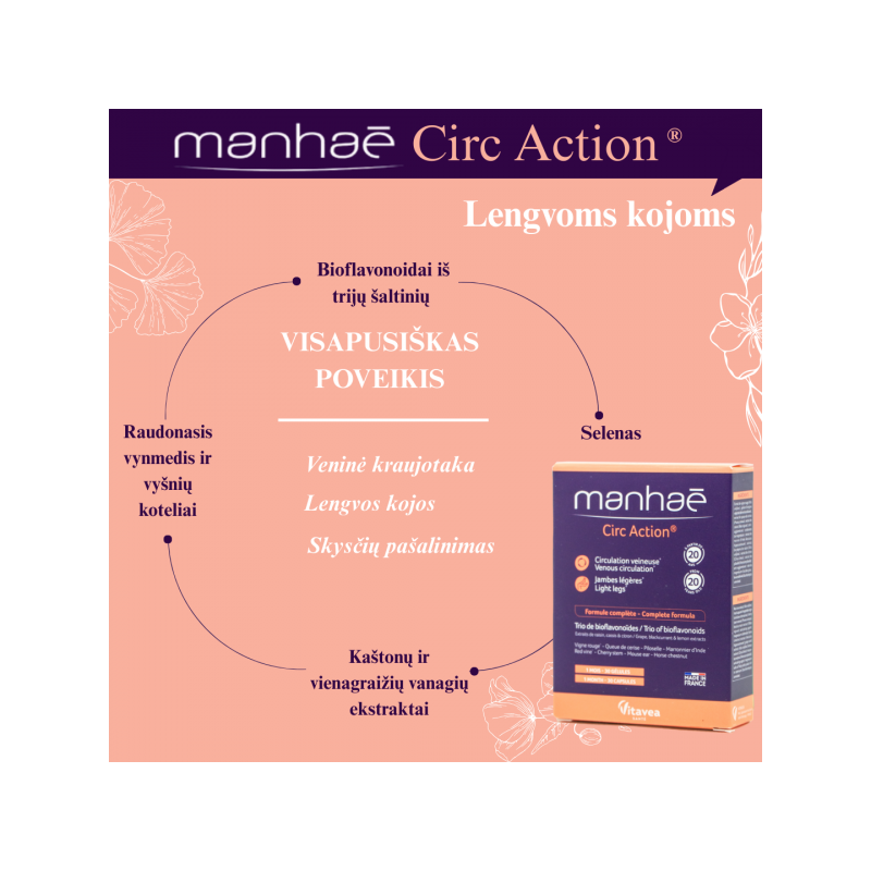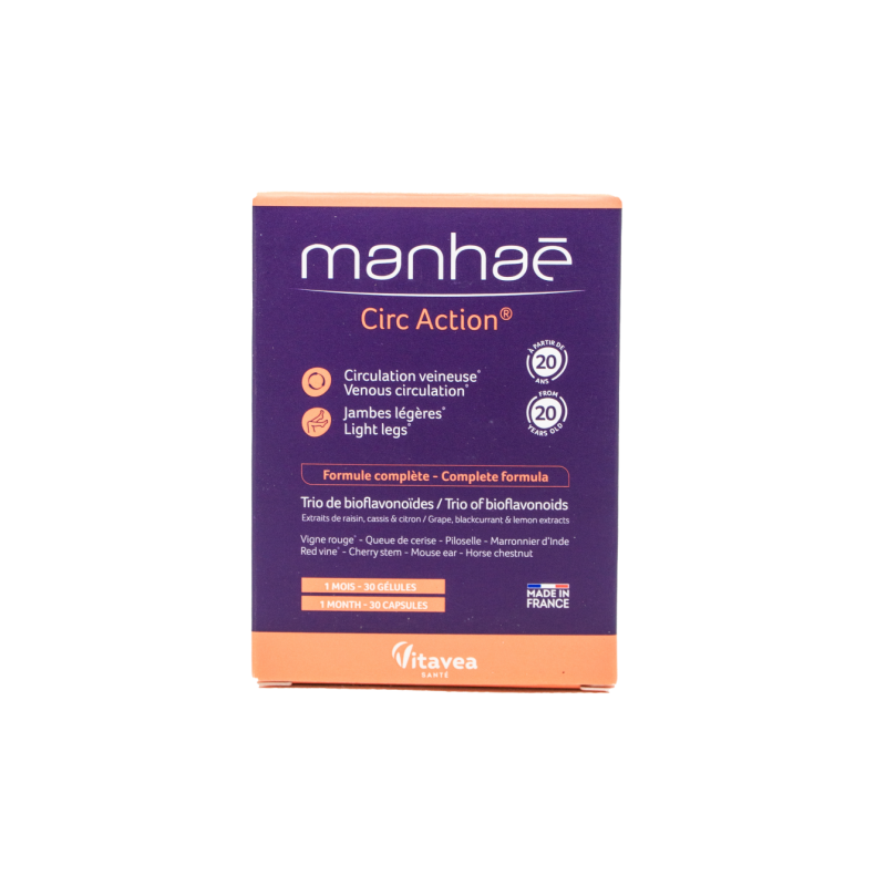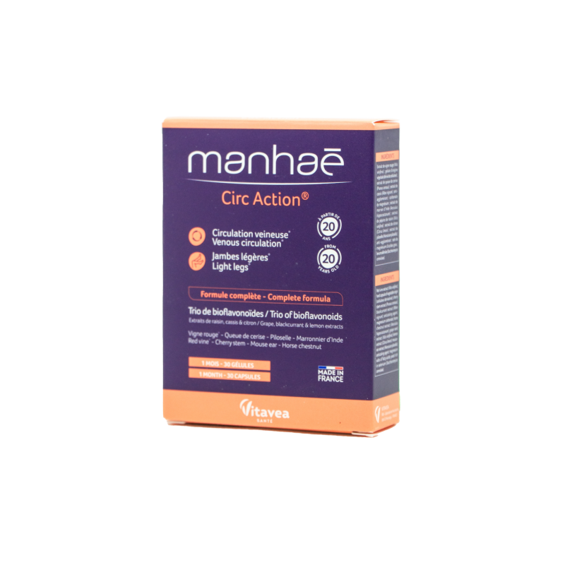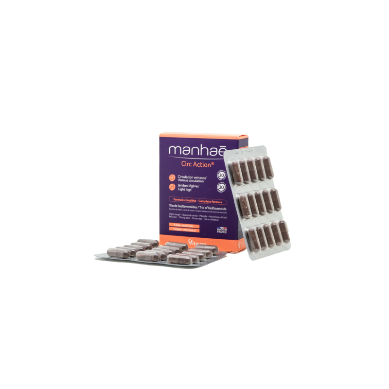 Vitavea Manhaé Circ Action jūsų sąjungininkas gerai veninei kraujotakai ir lengvoms kojoms.100 % natūrali formulė. Bioflavonoidai iš trijų šaltinių - vynuogių kauliukų, citrinų ir juodųjų serbentų ekstraktų. Formulė papildyta kitomis populiariomis ir pripažintomis veikliosiomis medžiagomis: vynmedžio, juodųjų serbentų, vyšnių stiebų, kaštonų, vienagraižių vanagių ekstraktais ir selenu.Maistinės medžiagos●Tikrojo vynmedžio ekstraktas padeda palaikyti normalią kraujagyslių sistemos veiklą, padeda apsaugoti ląsteles nuo oksidacinės pažaidos*.●Paprastųjų kaštonų ekstraktas padeda palaikyti normalų veninį tonusą, veninę kraujotaką*.●Paprastųjų vyšnių stiebų ekstraktas padeda palaikyti skysčių šalinimo iš organizmo funciją, normalią virškinimo funkciją*.●Selenas padeda apsaugoti ląsteles nuo oksidacinės pažaidos.*Teiginiai apie sveikatingumą laukia ES patvirtinimo. 2-ose kapsulėse:●Raudonojo vynmedžio ekstraktas: 250 mg ●Paprastųjų vyšnių stiebelių ekstraktas: 90 mg ●Juodųjų serbentų ekstraktas: 80 mg, kuriame antocianozidų: 8 mg ●Paprastųjų kaštonų ekstraktas: 80 mg ●Vynuogių sėklų ekstraktas: 80 mg, kuriame procianidinų: 76 mg ●Tikrojo citrinmedžio ekstraktas: 50 mg, kuriame bioflavonoidų: 25 mg ●Vienagraižių vanagių antžeminių dalių ekstraktas: 50 mg●Selenas: 16,5 µg (30% RMV*)RMV *- referencinė maistinė vertė.Maisto papildas. 30 augalinės kilmės kapsulių. Grynasis kiekis 14,5 g.Gamintojas: Vitavea - Laboratoires Yves Ponroy, Parc d'activité Sud Loire - 85612 Montaigu Cedex, PrancūzijGavėjas :