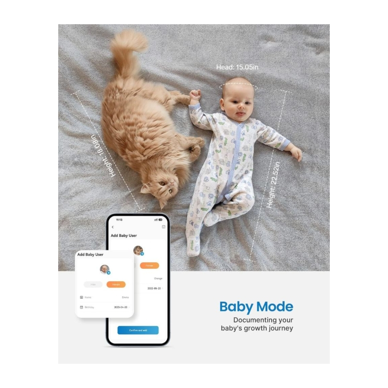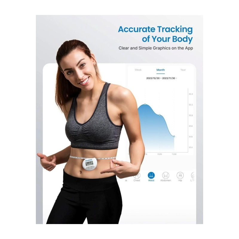 Išmanioji kūno matavimo juosta: Pilnai suderinama su RENPHO Health programėle ir leidžia efektyviai registruoti matavimus, padedant pasiekti kūno svorio ar raumenų tikslus.