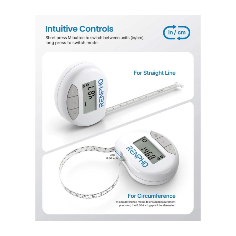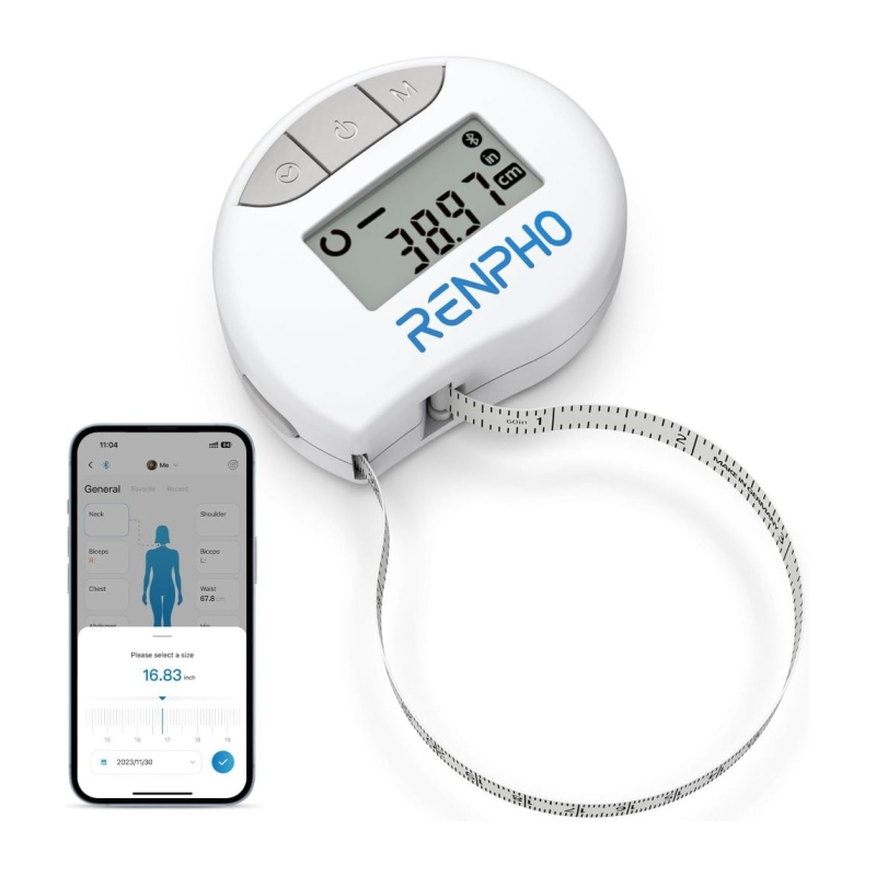 RENPHO išmanioji skaitmeninė kūno matavimo juosta leidžia greitai ir patogiai sekti kūno apimtis, naudojant lengvai valdomą „easy-lock“ kablį ir automatinio atleidimo funkciją. Prietaisas yra pilnai suderinamas su RENPHO Health programėle ir automatiškai sinchronizuoja duomenis coliais arba centimetrais, leidžiant lengvai stebėti pokyčius ir siekti fitneso bei kūno sudėties tikslų.