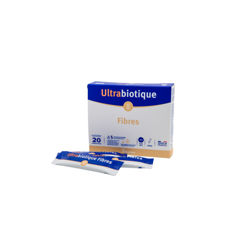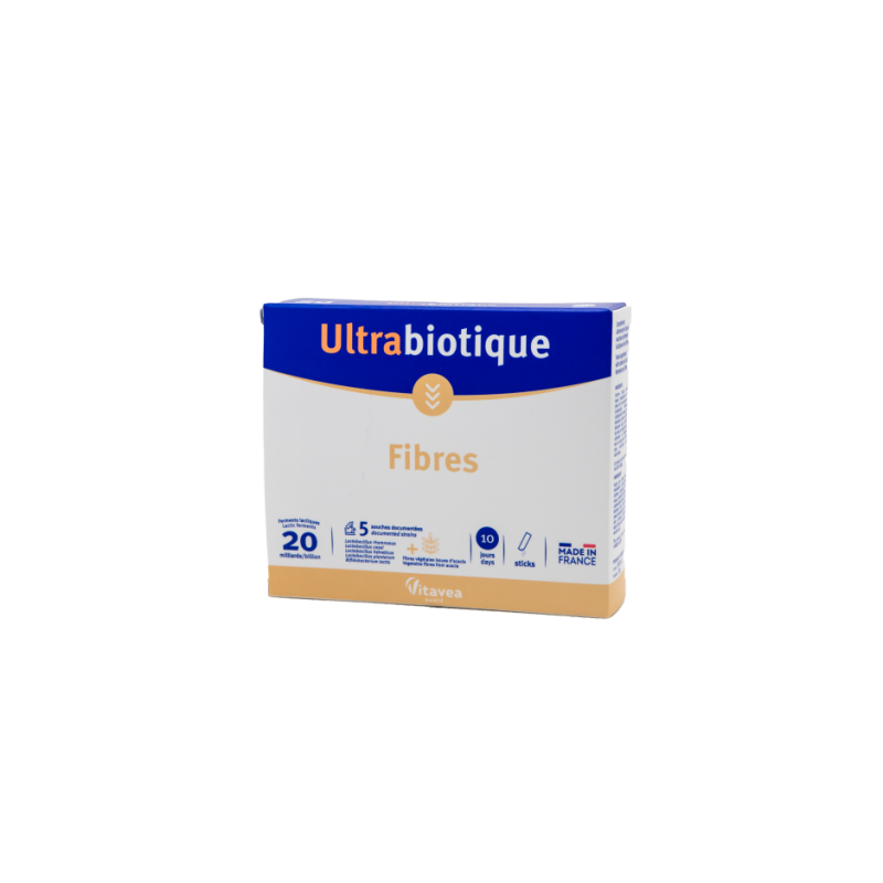Dieta, gyvenimo ritmo pokyčiai, stresas... gali turėti įtakos žarnyno floros pusiausvyrai ir vidurių užkietėjimui. Ultrabiotique Fibres formulėje yra didelė pieno bakterijų dozė ir švelnios, vidurius laisvinančios tirpios maistinės skaidulos Fibregum®. Padeda natūraliam žarnyno judėjimui ir žarnyno floros išlaikymui. Penkios, moksliškai dokumentais pagrįstos, bakterijų padermės*.●Penkių, moksliškai dokumentais pagrįstų pieno bakterijų sinergija, t.y. veikimas kartu ir didelė 20 milijardų šių bakterijų dozė, leidžia natūraliai atgauti reguliarų judėjimą ir išlaikyti žarnyno floros pusiausvyrą. ●Šios penkios pieno bakterijų padermės buvo atrinktos dėl jų atsparumo skrandžio rūgštingumui, tulžies druskoms ir dėl stipraus sukibimo su žarnyno ląstelėmis. Jos gyvos patenka į žarnyną ir garantuoja gerą kolonizaciją. ●Švelnios, vidurius laisvinančios tirpios maistinės skaidulos Fibregum® yra išgrynintos iš akacijos dervos, yra augalinės ir natūralios kilmės. Viename paketėlyje:●Plačiųjų akacijų derva 2655 mg, kurioje skaidulų 2389,5 mg. 20x109 KSV* gyvybingų pieno rūgšties bakterijų gamybos metu: ●Lactobacillus rhamnosus, ●Lactobacillus casei, ●Lactobacillus helveticus,●Lactobacillus plantarum, ●Bifidobacterium lactis. *KSV- kolonijas sudarančių vienetų.Maisto papildas. 10 lazdelių. Grynasis kiekis 30 g.Vartojimas: 1 lazdelė per dieną, praskiedžiant stikline vandens, geriausia valgio metu. Miltelius galima sumaišyti su maistu (jogurtu, kompotu ir kt.). Sudedamosios dalys: plačiųjų akacijų derva (Acacia seyal); maltodekstrinas; mikroorganizmų kompleksas: Lactobacillus rhamnosus, Lactobacillus casei, Lactobacillus helveticus, Lactobacillus plantarum, Bifidobacterium lactis; lipnumą reguliuojanti medžiaga: riebalų rūgščių magnio druskos; antioksidantas: askorbo rūgštis. Galimi sojos ir pieno pėdsakai.Nevartoti kaip maisto pakaitalo. Neviršyti rekomenduojamos paros normos. Tinkamumo laikui pasibaigus, produkto vartoti negalima. Laikyti ne aukštesnėje kaip 25°C temperatūroje, vaikams nepasiekiamoje vietoje. Svarbu įvairi ir subalansuota mityba bei sveikas gyvenimo būdas. *Moksliniai tyrimai: •Lactobacillus rhamnosus : Fiche Lallemand Lactobacillus rhamnosus GG; Dossier scientifique Lallemand; Thibault 2004; Mangell 2002; Kianifar et al, 2015; Gawronska et al, 2007; Cruchet et al., 2015; Braegger et al., 2011; Simadibrata et al., 2013; Hongisto, S., et al., 2006•Lactobacillus helveticus: Fiche souche Lallemand L Lafti; Clancy, R.L ir kt., 2006 m; Fiche Lallemand Lactobacillus helveticus Lafti L10; Dossier scientifique Lallemand; Fiche souche L Heleveticus Lafti L10.•Lactobacillus plantarum: Fiches souches L plantarum R1012 + B Breve HA129; Fiche Lallemand Lactobacillus plantarum Rosell-1012; Niedzielina, 2001; Levy, 1997; Hasslöf, 2010; Antonsson (review); Chlebcewicz-Szuba, 1998; Fiches souches L plantarum HA 119.•Lactobacillus casei: Fiche Lallemand Lactobacillus casei Rosell-215; Matsumoto, K., et al, 2010.•Bifidobacterium lactis: Fiche Lallemand Bifidobacterium lactis HA-194; Cruchet et al, 2015; Braegger et al, 2011; Derrien et al, 2019; Fiche Lallemand.Gamintojas: Vitavea, laboratoires Vitarmonyl, 85612 Montaigu, Prancūzija.