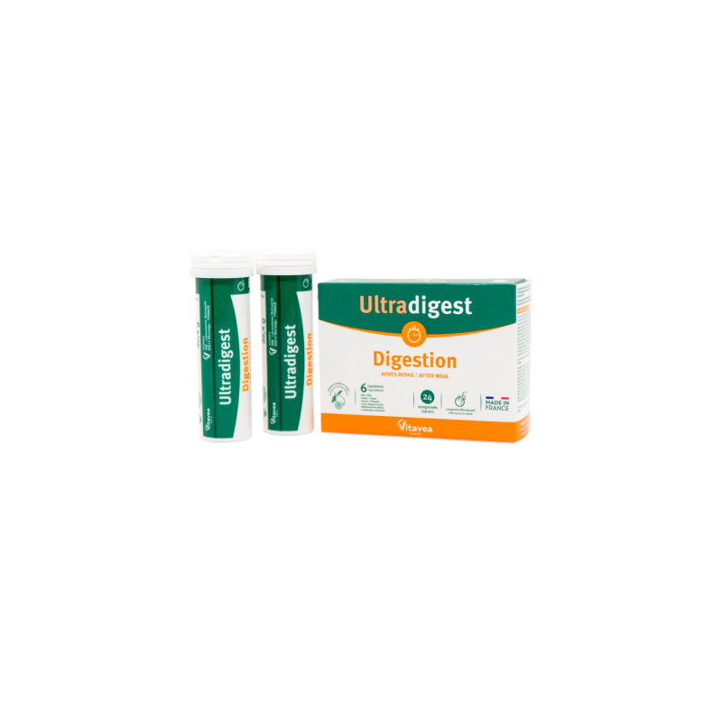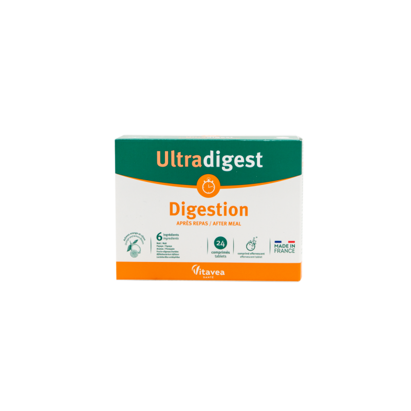 Padeda pašalinti sunkumą ir diskomfortą po valgio.●Natūralios kilmės veikliosios medžiagos ●Gero apelsinų/citrinų skonio ●Pagaminta Prancūzijoje Virškinimas yra procesas, kurio metu maistas paverčiamas būtinomis maistinėmis medžiagomis, reikalingomis tinkamam organizmo funkcionavimui. Žmogaus organizmas natūraliai gamina virškinimo fermentus, tačiau yra atvejų, kada organizmui gali pritrūkti virškinimui svarbių fermentų. VITAVEA „Digestion virškinimui“ yra maisto papildas, kurio pagrindą sudaro pieno rūgšties bakterijos, natūraliai esančios virškinamajame trakte, taip pat paprastųjų miežių salyklo, papajos bei ananasų ekstraktai. Šiuose ekstraktuose yra natūralių augalinių fermentų, skaidančių riebalus, baltymus, angliavandenius, įskaitant krakmolą.MAISTINĖS MEDŽIAGOS●Papajinio melionmedžio, ananasų ir paprastųjų miežių salyklo ekstraktai, kuriuose yra natūralių virškinimo fermentų.●Pieno rūgšties bakterijos, natūraliai esančios virškinamajame trakte.●Frukto-oligosacharidai yra prebiotikai, t. y. gerųjų žarnyno bakterijų maistas, jų mitybai ir dauginimuisi reikalinga maistinė medžiaga. 1-oje tabletėje●Paprastųjų miežių salyklo ekstraktas (Hordeum vulgare): 300 mg; ●Frukto-oligosacharidai: 100 mg;●Papajinio melionmedžio ekstraktas (Carica papaja): 70 mg;●Ananasų ekstraktas: 50 mg; ●Pieno rūgšties bakterijos (Bifidobacterium bifidum, Lactobacillus acidophilus): 10 mg.Maisto papildas. 24 tirpstančios tabletės po 2,7 g. Grynasis kiekis 64,8 g. Su saldikliu.Gamintojas: Vitavea - Laboratoires Yves Ponroy, Parc d'activité Sud Loire - 85612 Montaigu Cedex, PrancūzijGavėjas :