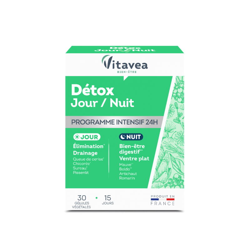INTENSYVI 24 VAL.DETOKSIKACIJOS PROGRAMADIENA → Detoksikacija Skysčių pasišalinimas Vyšnių stiebeliai Trūkažolė (cikorija) Šeivamedis KiaulpienėNAKTIS → Virškinimo komfortas Plokščias pilvas Miškinė dedešva Čilmedis Artišokas RozmarinasVITAVEA DETOX DAY/NIGHT formulė – tai jūsų detoksikacijos pagalbininkas, siūlantis intensyvią 24 valandų programą. Šis maisto papildas, praturtintas vyšnių stiebelių, paprastųjų trūkažolių, juoduogių šeivamedžių, paprastųjų kiaulpienių, miškinės dedešvos, kvapiojo čilmedžio lapų, daržovinių artišokų ir kvapiųjų rozmarinų ekstraktais, užtikrina dienos poveikį, padedantį palaikyti skysčių šalinimą, bei nakties poveikį, prisidedantį prie virškinimo komforto ir plokštesnio pilvo.PRODUKTO PRIVALUMAI●Intensyvus kompleksinis veikimas 24 valandas.●Dienos ir nakties organizmo valymo programa.●Pagaminta Prancūzijoje, Vitavea laboratorijoje Vandėja regione, laikantis geros gamybos praktikos (GGP) ir kokybės (ANSM - Nacionalinės vaistų ir sveikatos produktų saugos agentūros) procesų. MAISTINĖS MEDŽIAGOS●Juoduogis šeivamedis padeda palaikyti organizmo valymo/detoksikacijos funkciją, normalų skysčių šalinimą iš organizmo, normalią gliukozės apykaitą, normalią imuninės sistemos veiklą, normalią kvėpavimo takų funkciją ir padeda apsaugoti ląsteles nuo oksidacinės pažaidos.* ●Paprastųjų vyšnių stiebeliai padeda palaikyti normalią skysčių šalinimo iš organizmo funciją.*●Paprastosios kiaulpienės padeda palaikyti organizmo valymo funkciją, normalų skysčių šalinimą iš organizmo, normalią kepenų funkciją, normalią skrandžio veiklą. Kiaulpienių šaknis pasižymi prebiotinėmis savybėmis, kurios gali padėti normaliai virškinimo funkcijai.*●Paprastosios trūkažolės (cikorijos) padeda palaikyti kūno svorio kontrolę, organizmo valymo/detoksikacijos funkciją, normalų skysčių šalinimą iš organizmo, kepenų, žarnyno, širdies/kraujagyslių funkcijas.* ●Miškinė dedešva padeda palaikyti virškinamojo trakto funkcijas, padeda esant vidurių užkietėjimui, padeda palaikyti ryklės ir kvėpavimo takų funkcijas.*●Kvapusis čilmedis padeda palaikyti normalias virškinimo sistemos, kepenų funkcijas, padeda palaikyti organizmo fizinę savijautą, organizmo atsigavimą po psichofizinio streso, padeda apsaugoti ląsteles nuo oksidacinės pažaidos.* ●Daržoviniai artišokai padeda palaikyti normalią kepenų funkciją, padeda palaikyti normalų kūno svorį, skysčių šalinimą iš organizmo, padeda palaikyti normalų virškinimą ir žarnyno funkciją, padeda apsaugoti ląsteles nuo oksidacinės pažaidos*.●Kvapieji rozmarinai ekstraktas padeda palaikyti normalų skysčių šalinimą iš organizmo, padeda palaikyti normalią kepenų funkciją ir jų apsaugą nuo kai kurių toksinių cheminių medžiagų, padeda palaikyti organizmo tonusą, padeda apsaugoti ląsteles nuo oksidacinės pažaidos.* *Teiginiai apie sveikatingumą laukia ES patvirtinimo. 1-oje dienos kapsulėje:●Juoduogio šeivamedžio (ekvivalentas) 300 mg, ekstrakto 100 mg●Vyšnių stiebelių ekstraktas 90 mg●Paprastųjų kiaulpienių ekstraktas 40 mg●Paprastųjų trūkažolių šaknų ekstraktas 25 mg 1-oje nakties kapsulėje:●Miškinės dedešvos (ekvivalentas) 300 mg, ekstrakto 75 mg●Kvapiojo čilmedžio (ekvivalentas) 210 mg, ekstrakto 70 mg●Daržovinių artišokų ekstraktas 60 mg●Kvapiojo rozmarino ekstraktas 50 mg Maisto papildas. 30 augalinės kilmės kapsulių. Grynasis kiekis 16,8 g.Partijos Nr. ir „Geriausias iki pabaigos“ nurodyta ant pakuotės. Pakuotės kokybės ir aplinkosaugos charakteristikos: Perdirbtos medžiagos naudojimas pakuotėje: dėžutė 0 %, lizdinė plokštelė: 0%Pavojingos medžiagos pakuotėje: nėraPavojingos medžiagos gaminyje: nėraKompostuojama pakuotė: ne (lizdinė plokštelė)Pakuotė: dažniausiai perdirbama (popierinė dėžutė)Gamintojas: Vitavea, 85612 Montaigu Cedex, Prancūzija.Gavėjas :