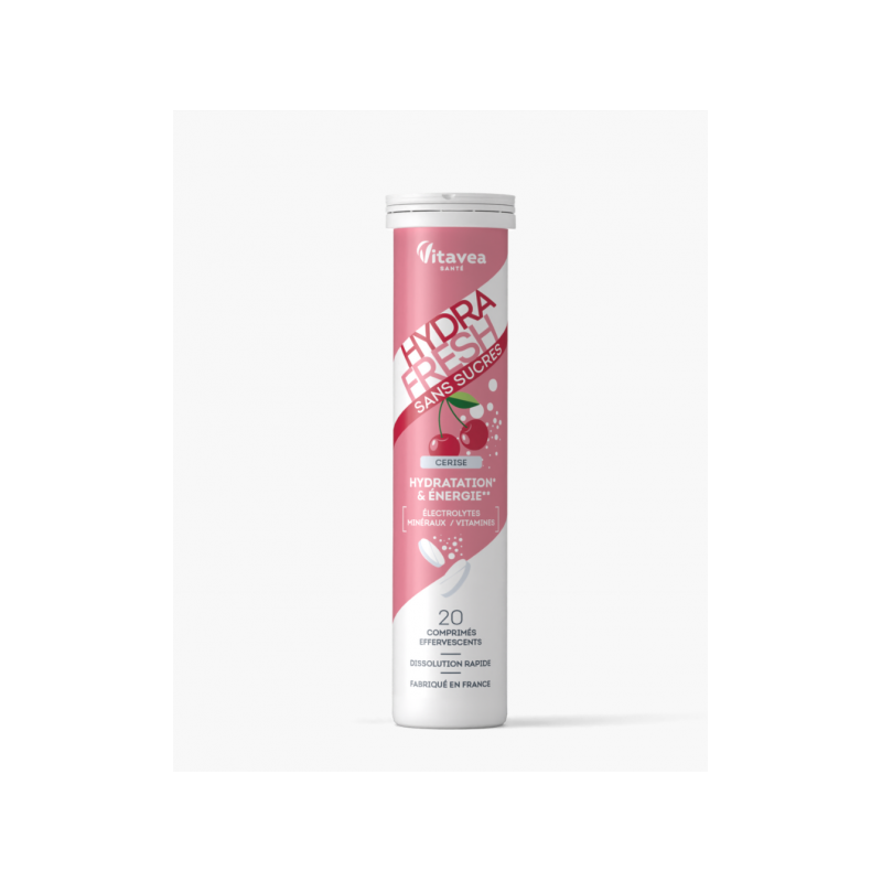 UNIVERSALUS SPRENDIMAS KASDIENEI HIDRATACIJAI IR ENERGIJAIHYDRAFRESH be cukraus – tai elektrolitų, mikroelementų bei B ir C grupės vitaminų derinys, skirtas papildyti kasdienę mitybą ir padėti palaikyti optimalią organizmo hidrataciją ir energijos apykaitą. Šį maisto papildą galima vartoti bet kuriuo metų laiku. Jis idealiai tinka kasdieniam vartojimui, sportuojantiems, senjorams, kelionių metu, esant dideliems karščiams ar kitą dieną po vakarėlių, kai organizmui ypač svarbu palaikyti optimalią hidrataciją ir veiksmingą organizmo palaikymą.PAGRINDINĖS SAVYBĖS●Padeda išlaikyti elektrolitų pusiausvyrą Magnis●Padeda palaikyti normalų virškinimą sudarydami druskos rūgštį skrandyje Chloridai●Padeda palaikyti normalią energijos apykaitąMagnis, kalcis, manganas, vitaminai B1, B3, B5, B6, B8, B12, C●Padeda palaikyti normalią imuninės sistemos veiklą Cinkas, vitaminai B6, B9, B12, C●Padeda mažinti pavargimo jausmą ir nuovargįMagnis, vitaminai B3, B5, B6, B9, B12, CPRIVALUMAI●Be cukraus.●Be dirbtinių dažiklių ir dirbtinių aromatinių kvapiųjų medžiagų.●Be GMO.●Be pesticidų.●Be konservantų.●Tirpstančios tabletės.●Pagaminta Prancūzijoje, Vitavea laboratorijoje Vandėja regione, laikantis geros gamybos praktikos (GGP) ir kokybės (ANSM - Nacionalinės vaistų ir sveikatos produktų saugos agentūros) procesų. 2-ose tabletėse:●Vitaminas C 24 mg (30 % RMV*) ●Vitaminas B1 1,1 mg (100 % RMV*)●Vitaminas B3 16 mg (100 % RMV*) ●Vitaminas B5 6 mg (100 % RMV*) ●Vitaminas B6 1,4 mg (100 % RMV*) ●Vitaminas B8 50 µg (100 % RMV*) ●Vitaminas B9 200 µg (100 % RMV*) ●Vitaminas B12 2,5 µg (100 % RMV*) ●Kalis 300 mg (15 % RMV*) ●Chloridai 277 mg (34,6 % RMV*) ●Kalcis 120 mg (15 % RMV*) ●Magnis 112,5 mg (30 % RMV*) ●Cinkas 3 mg (30 % RMV*) ●Manganas 0,6 mg (30 % RMV*) ●Natris 200 mg * RMV: referencinė maistinė vertė Maisto papildas. 20 tirpstančių tablečių. Grynasis kiekis 58 g.Partijos Nr. ir geriausias iki pabaigos: nurodyta ant pakuotės. Gamintojas: Vitavea, 85612 Montaigu Cedex, PrancūzijGavėjas :